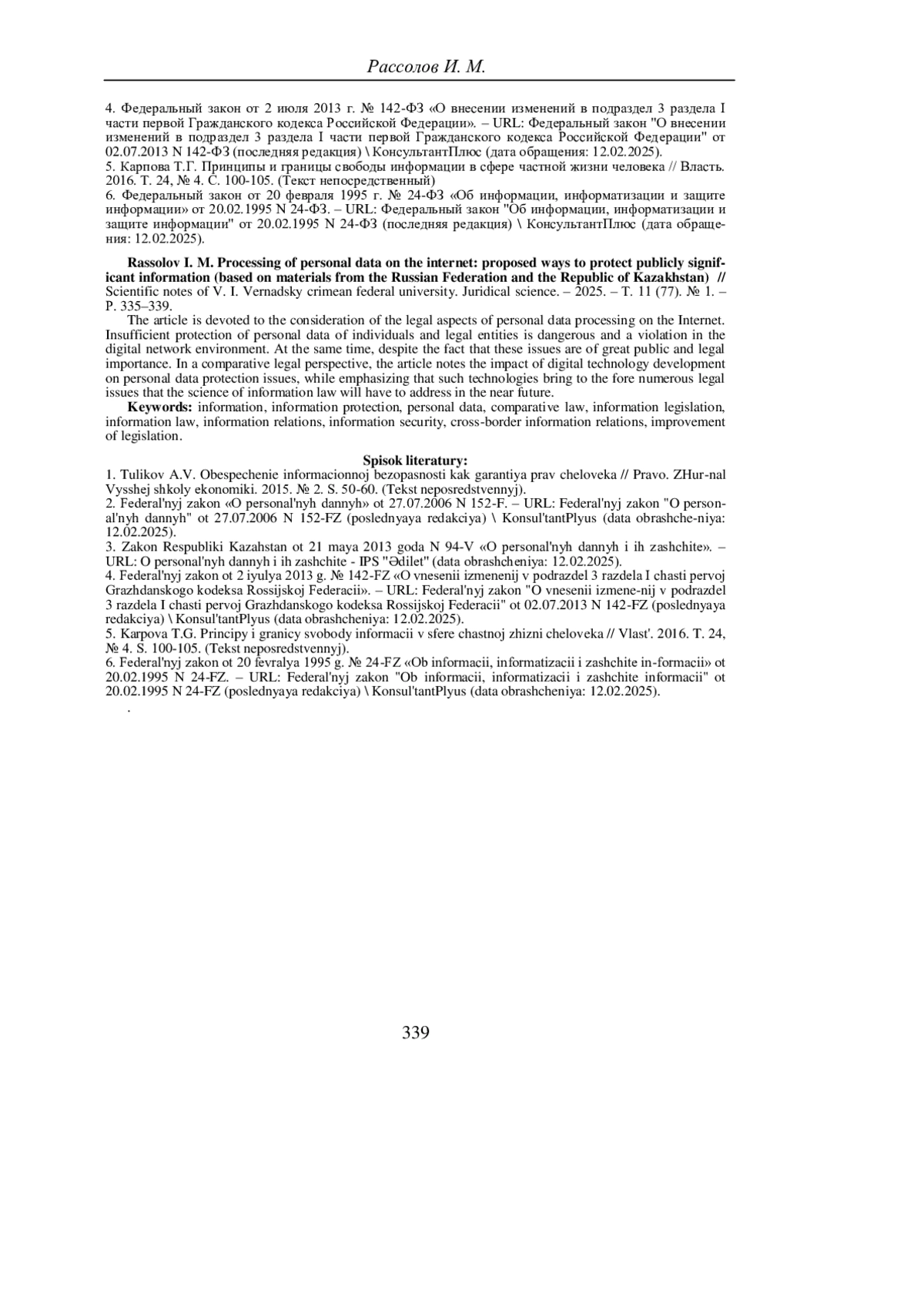 РАССОЛОВ И. М. ОБРАБОТКА ПЕРСОНАЛЬНЫХ ДАННЫХ В ИНТЕРНЕТЕ: ПРЕДЛАГАЕМЫЕ СПОСОБЫ ЗАЩИТЫ ПУБЛИЧНО-ЗНАЧИМОЙ ИНФОРМАЦИИ (НА МАТЕРИАЛАХ РОССИЙСКОЙ ФЕДЕРАЦИИ И РЕСПУБЛИКИ КАЗАХСТАН) // УЧЕНЫЕ ЗАПИСКИ КРЫМСКОГО ФЕДЕРАЛЬНОГО УНИВЕРСИТЕТА ИМЕНИ В. И. ВЕРНАДСКОГО. ЮРИДИЧЕСКИЕ НАУКИ. 2025. ТОМ 11(77). №1