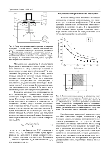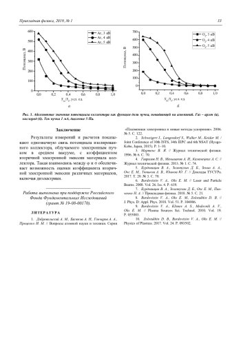 В статье представлены результаты измерения потенциала изолированного коллектора, облучаемого электронным пучком в среднем вакууме, при различных значениях  – коэффициента вторичной электронной эмиссии электронов (ВЭЭ). Изменение  обеспечено плавным перемещением относительно электронного пучка коллектора, составленного из двух металлов (алюминия и титана) с резко различающимися значениями коэффициента ВЭЭ. Предложена модель, удовлетворительно описывающая измеренную зависимость, и методика, позволяющая по установившемуся потенциалу изолированного коллектора оценивать коэффициент ВЭЭ различных материалов, в том числе и диэлектриков.