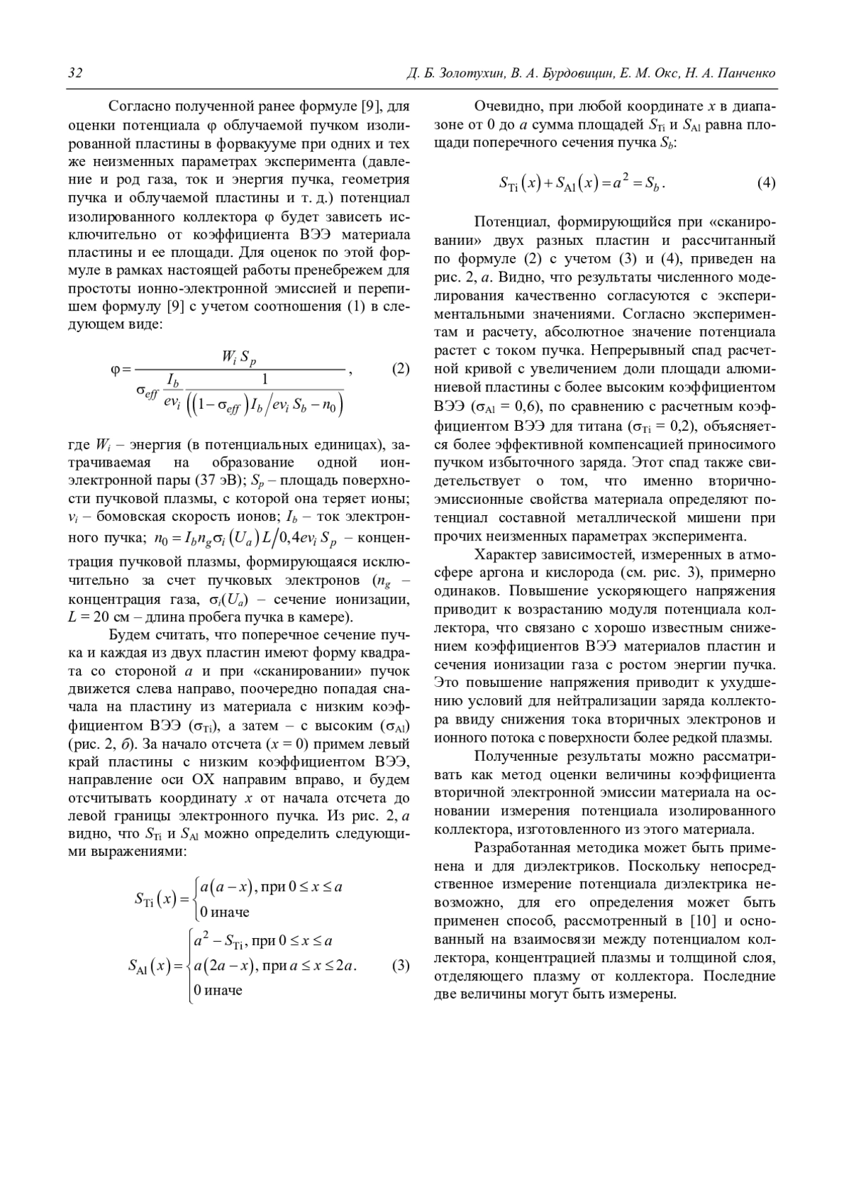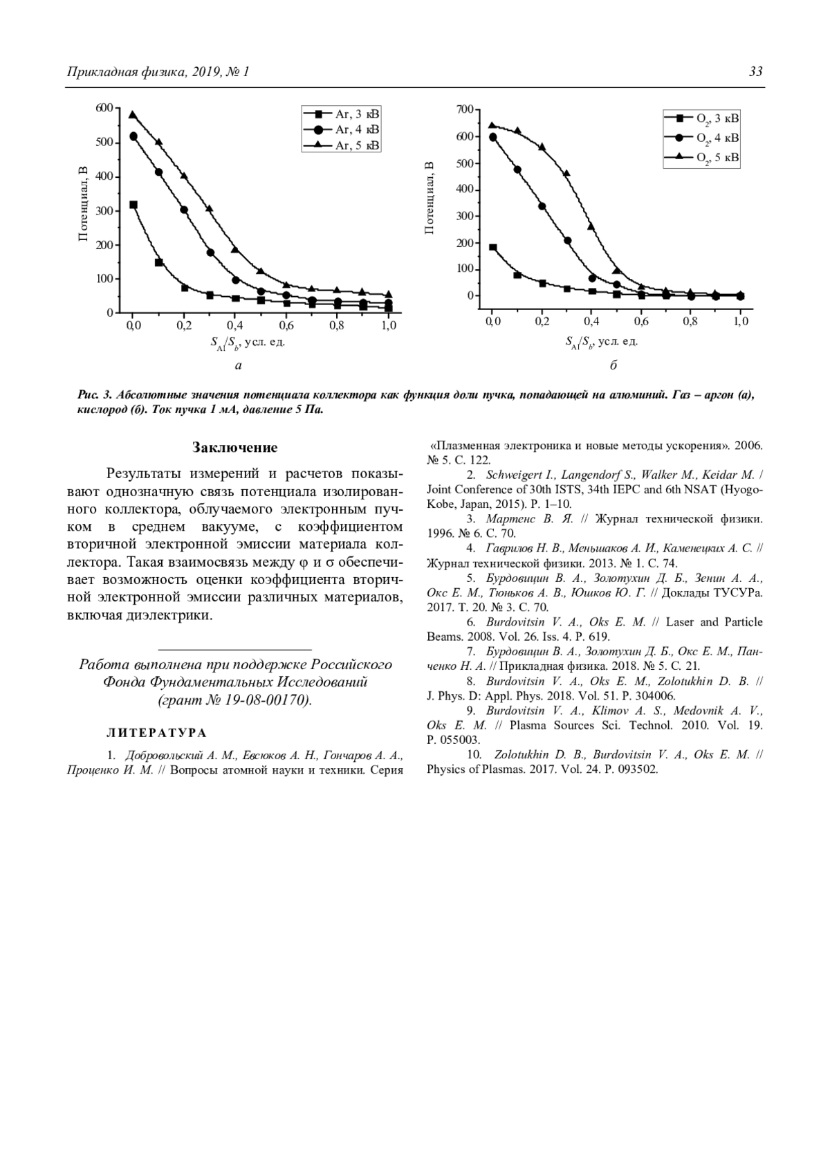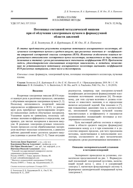 ЗОЛОТУХИН Д. Б., БУРДОВИЦИН В., ОКС Е., ПАНЧЕНКО Н. А. ПОТЕНЦИАЛ СОСТАВНОЙ МЕТАЛЛИЧЕСКОЙ МИШЕНИ ПРИ ЕЁ ОБЛУЧЕНИИ ЭЛЕКТРОННЫМ ПУЧКОМ В ФОРВАКУУМНОЙ ОБЛАСТИ ДАВЛЕНИЙ // ПРИКЛАДНАЯ ФИЗИКА. 2019. №1