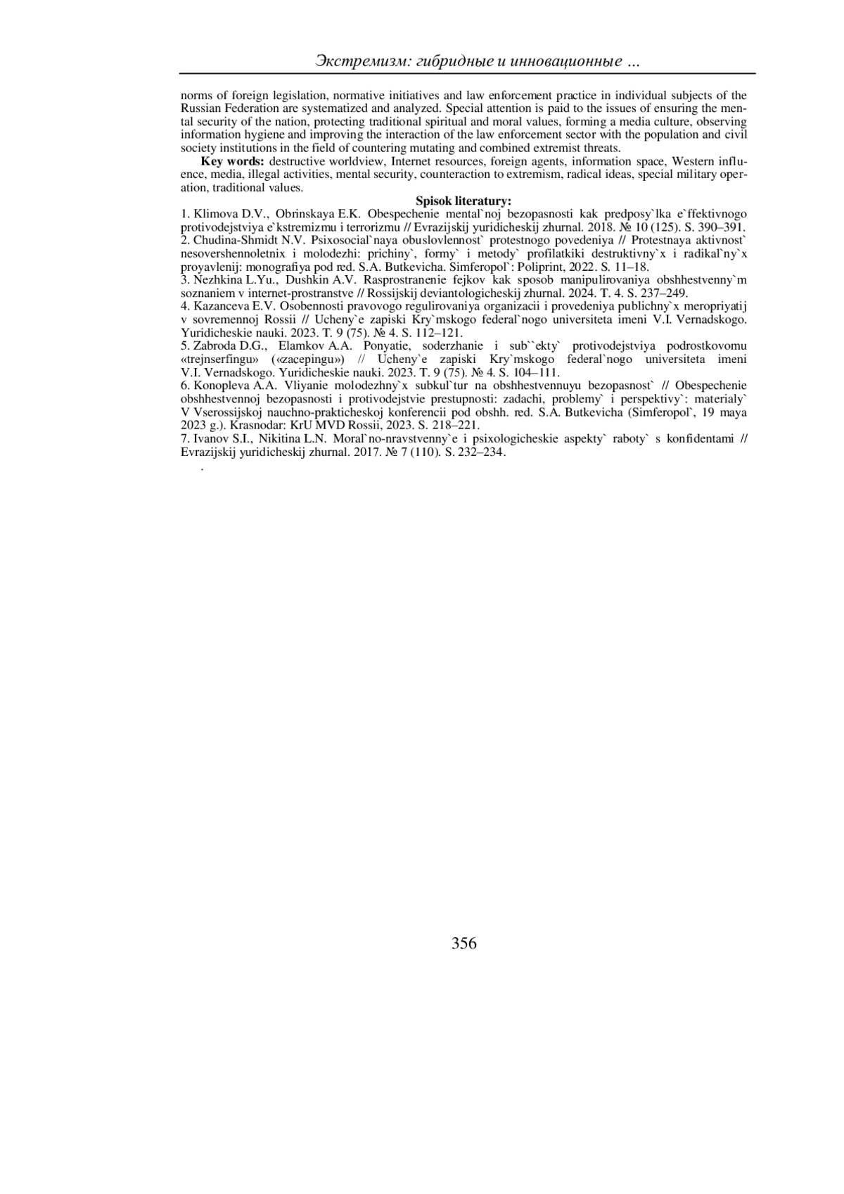 1. Климова Д.В., Обринская Е.К. Обеспечение ментальной безопасности как предпосылка эффективного противодействия экстремизму и терроризму // Евразийский юридический журнал. 2018. № 10 (125). С. 390-391. EDN: AIKYYJ