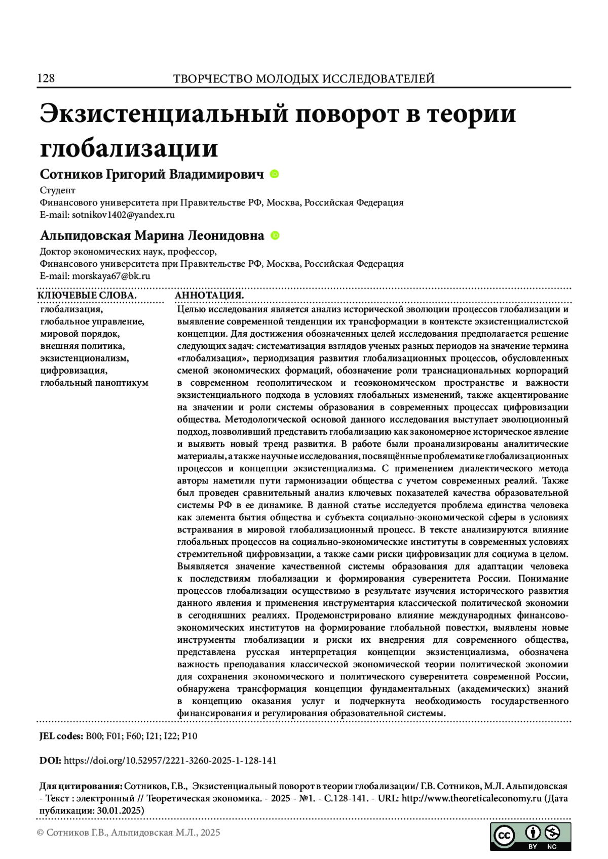 Целью исследования является анализ исторической эволюции процессов глобализации и выявление современной тенденции их трансформации в контексте экзистенциалистской концепции. Для достижения обозначенных целей исследования предполагается решение следующих задач: систематизация взглядов ученых разных периодов на значение термина «глобализация», периодизация развития глобализационных процессов, обусловленных сменой экономических формаций, обозначение роли транснациональных корпораций в современном геополитическом и геоэкономическом пространстве и важности экзистенциального подхода в условиях глобальных изменений, также акцентирование на значении и роли системы образования в современных процессах цифровизации общества. Методологической основой данного исследования выступает эволюционный подход, позволивший представить глобализацию как закономерное историческое явление и выявить новый тренд развития. В работе были проанализированы аналитические материалы, а также научные исследования, посвящённые проблематике глобализационных процессов и концепции экзистенциализма. С применением диалектического метода авторы наметили пути гармонизации общества с учетом современных реалий. Также был проведен сравнительный анализ ключевых показателей качества образовательной системы РФ в ее динамике. В данной статье исследуется проблема единства человека как элемента бытия общества и субъекта социально-экономической сферы в условиях встраивания в мировой глобализационный процесс. В тексте анализируются влияние глобальных процессов на социально-экономические институты в современных условиях стремительной цифровизации, а также сами риски цифровизации для социума в целом. Выявляется значение качественной системы образования для адаптации человека к последствиям глобализации и формирования суверенитета России. Понимание процессов глобализации осуществимо в результате изучения исторического развития данного явления и применения инструментария классической политической экономии в сегодняшних реалиях. Продемонстрировано влияние международных финансово-экономических институтов на формирование глобальной повестки, выявлены новые инструменты глобализации и риски их внедрения для современного общества, представлена русская интерпретация концепции экзистенциализма, обозначена важность преподавания классической экономической теории политической экономии для сохранения экономического и политического суверенитета современной России, обнаружена трансформация концепции фундаментальных (академических) знаний в концепцию оказания услуг и подчеркнута необходимость государственного финансирования и регулирования образовательной системы.
