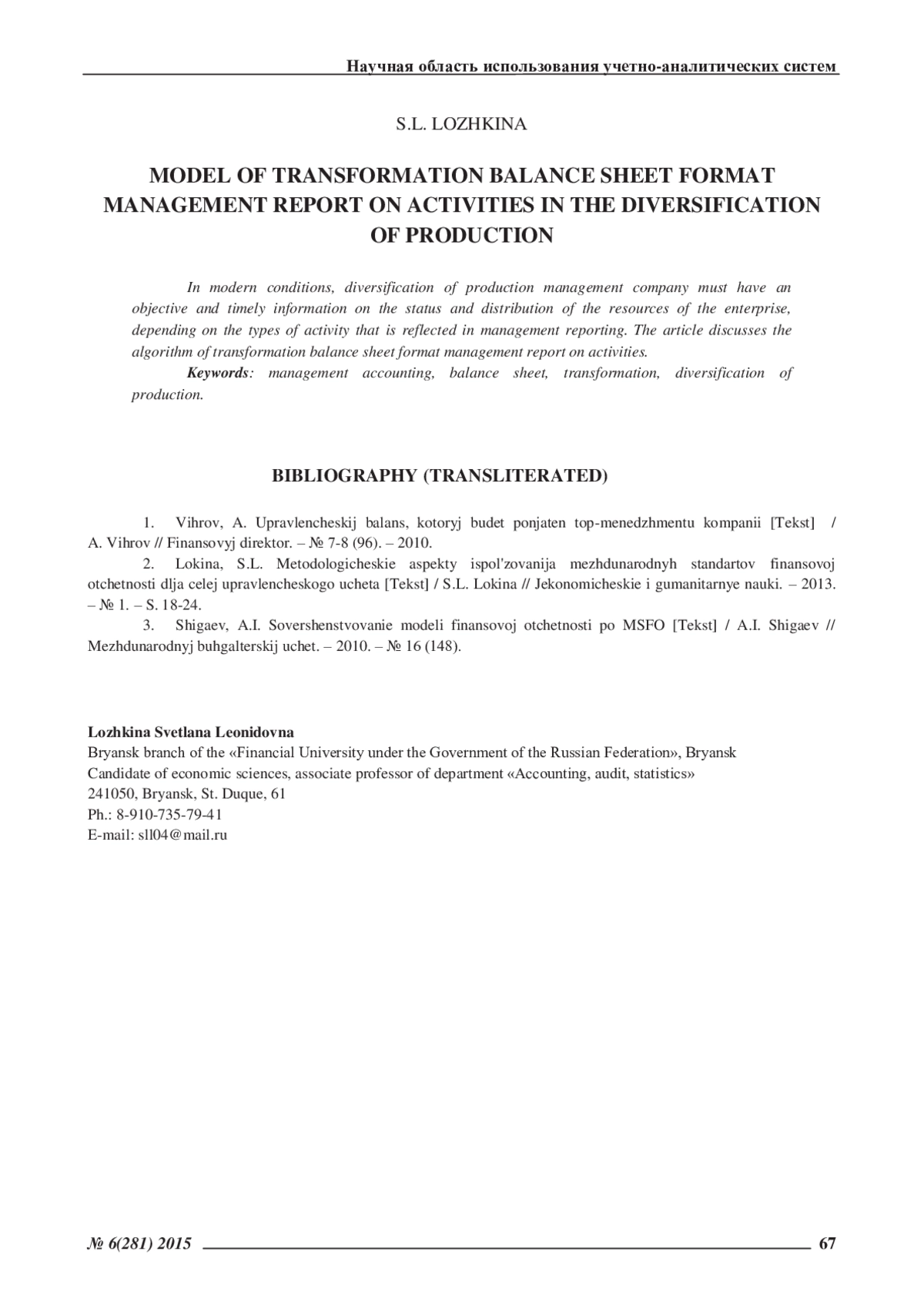 ЛОЖКИНА С. Л. МОДЕЛЬ ТРАНСФОРМАЦИИ БУХГАЛТЕРСКОГО БАЛАНСА В ФОРМАТ УПРАВЛЕНЧЕСКОГО ОТЧЕТА ПО ВИДАМ ДЕЯТЕЛЬНОСТИ В УСЛОВИЯХ ДИВЕРСИФИКАЦИИ ПРОИЗВОДСТВА // ЭКОНОМИЧЕСКИЕ И ГУМАНИТАРНЫЕ НАУКИ. 2015. № 6 (281)