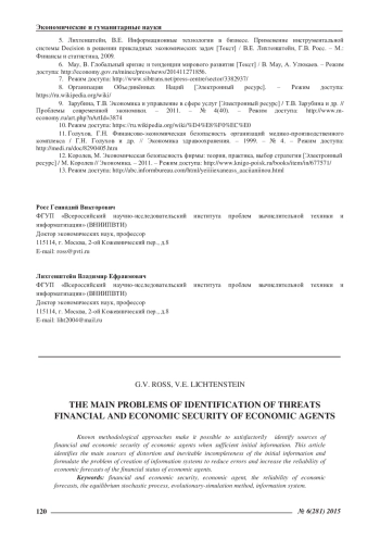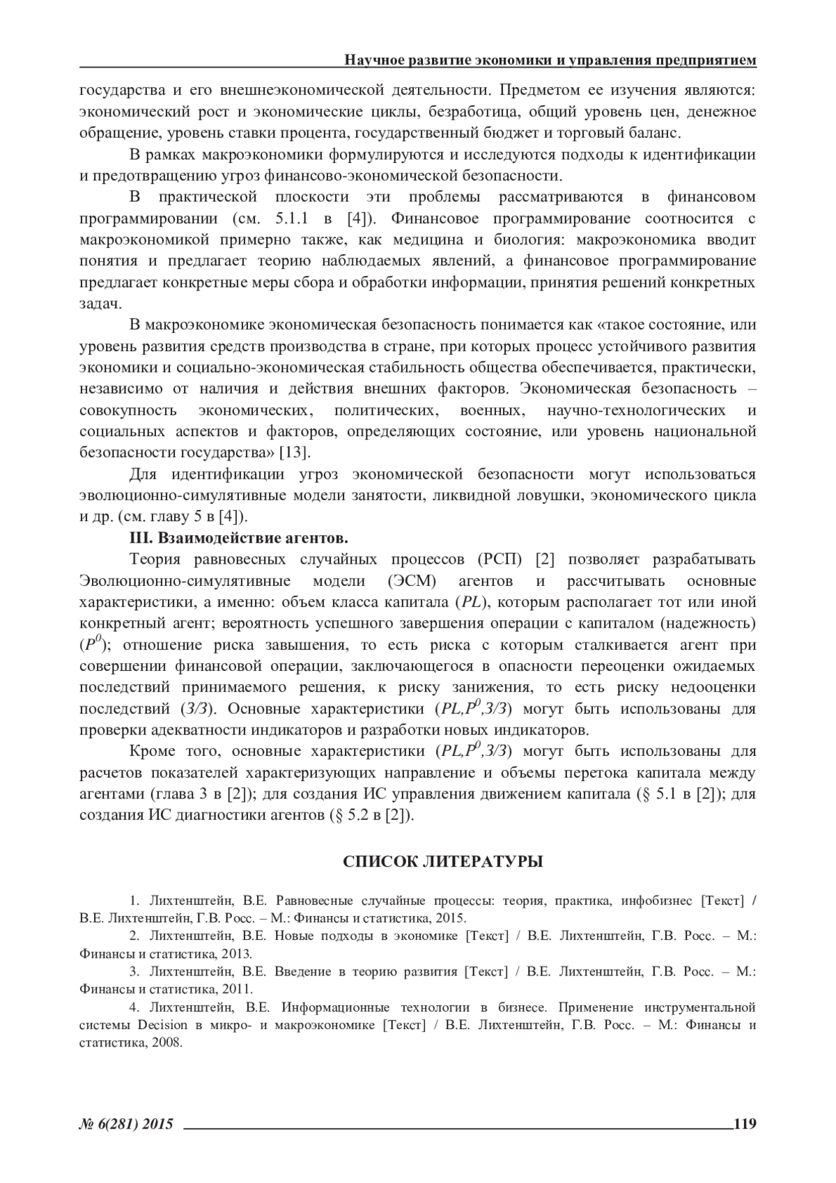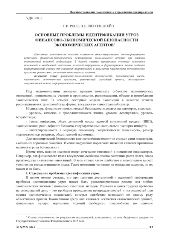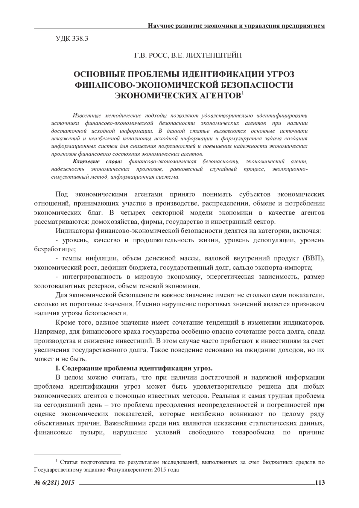 РОСС Г. В., ЛИХТЕНШТЕЙН В. Е. ОСНОВНЫЕ ПРОБЛЕМЫ ИДЕНТИФИКАЦИИ УГРОЗ ФИНАНСОВО-ЭКОНОМИЧЕСКОЙ БЕЗОПАСНОСТИЭКОНОМИЧЕСКИХ АГЕНТОВ // ЭКОНОМИЧЕСКИЕ И ГУМАНИТАРНЫЕ НАУКИ. 2015. № 6 (281)