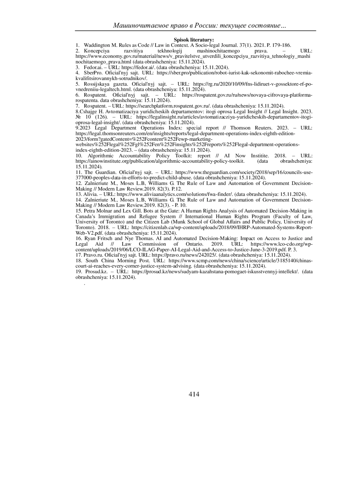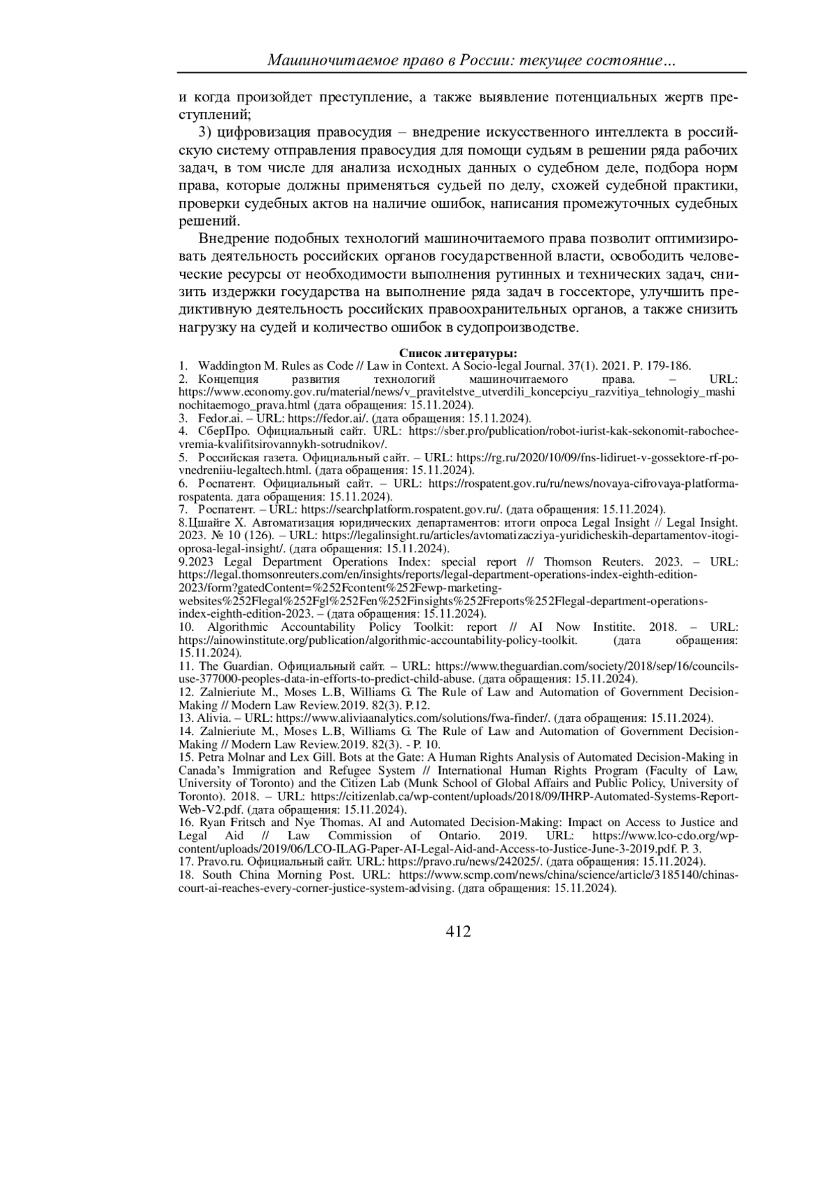 16. Ryan Fritsch and Nye Thomas. AI and Automated Decision-Making: Impact on Access to Justice and Legal Aid // Law Commission of Ontario. 2019. URL: https://www.lco-cdo.org/wpcontent/uploads/2019/06/LCO-ILAG-Paper-AI-Legal-Aid-and-Access-to-Justice-June-3-2019.pdf. P. 3.