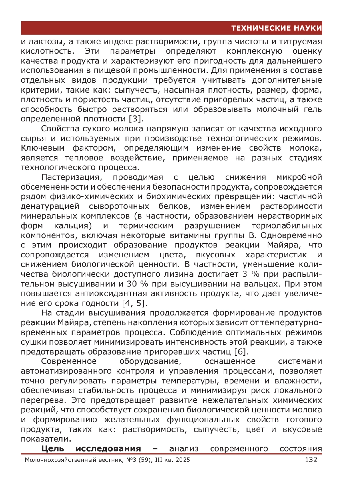 В статье представлен анализ современных аспектов технологии производства сухого молока, включающего подготовку молока-сырья, его тепловую обработку, концентрирование, высушивание, агломерирование, упаковывание и хранение. Особое внимание уделено влиянию режимов тепловой обработки и высушивания на степень денатурации белков, развитие реакции Майяра и связанное с этим изменение физико-химических свойств и биологической ценности сухого молока. Подробно рассмотрена классификация сухого обезжиренного молока по тепловым классам на основе индекса азота сывороточных белков (WPNI), что определяет его ключевые свойства и области применения в пищевой промышленности. Показано, что достижение высокого качества и заданных функциональных свойств продукта возможно лишь при строгом контроле технологических параметров на всех этапах производства и хранения. Отмечены современные тенденции в отрасли, такие как: внедрение энергоэффективных технологий, мембранных методов концентрирования, совершенствование процессов сушки и агломерирования, что позволяет расширить ассортимент специализированных продуктов, улучшить их функциональные свойства и увеличить сроки хранения.