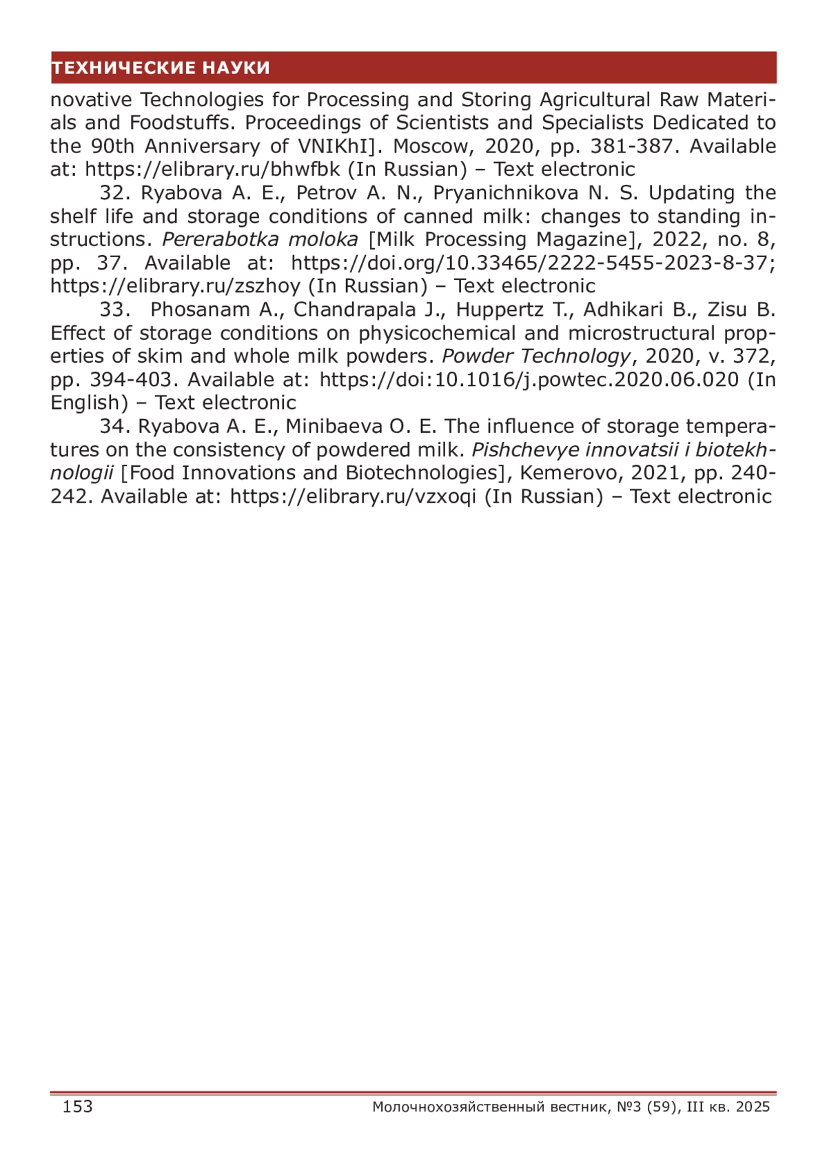 34. Рябова, А.Е. Актуализация сроков годности и условий хранения молочных консервов: изменения в действующие инструкции / А.Е. Рябова, А.Н. Петров, Н.С. Пряничникова // Переработка молока. - 2022. - № 8. - С. 37. URL:. DOI: 10.33465/2222-5455-2023-8-37
