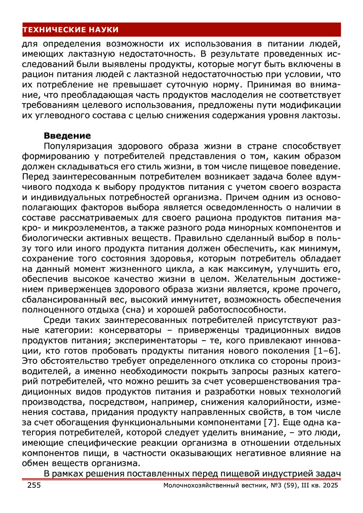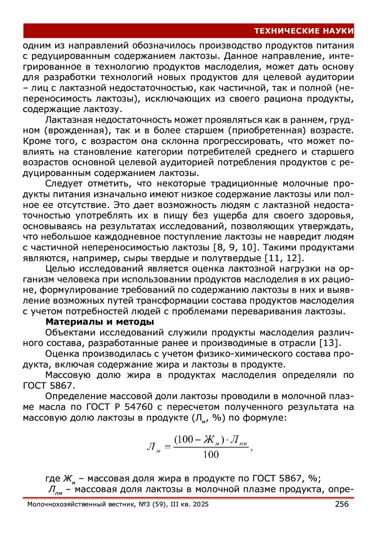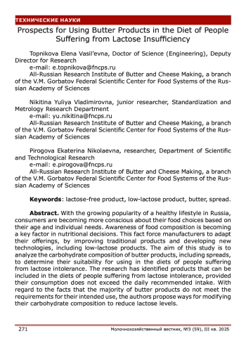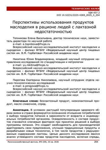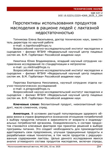 ТОПНИКОВА Е. В., НИКИТИНА Ю. В. ПЕРСПЕКТИВЫ ИСПОЛЬЗОВАНИЯ ПРОДУКТОВ МАСЛОДЕЛИЯ В РАЦИОНЕ ЛЮДЕЙ С ЛАКТАЗНОЙ НЕДОСТАТОЧНОСТЬЮ // МОЛОЧНОХОЗЯЙСТВЕННЫЙ ВЕСТНИК. 2025. № 3 (59)
