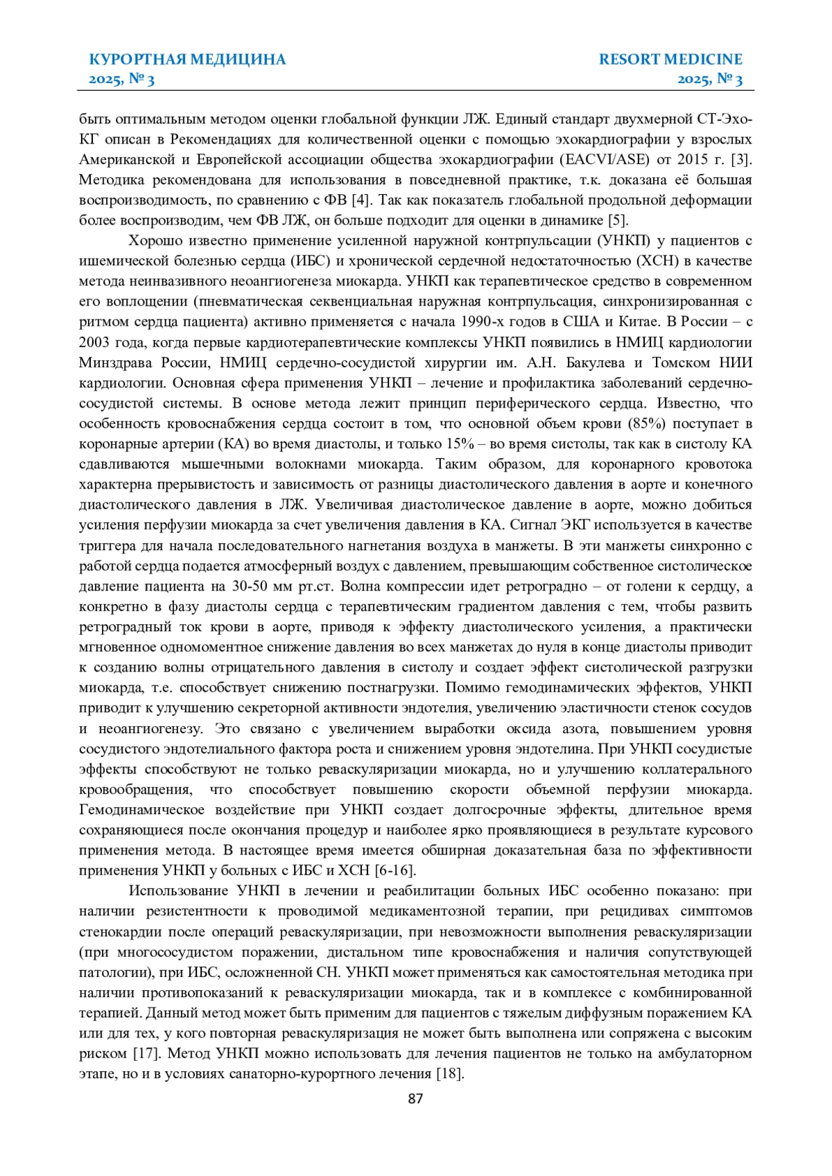 Выводы. Показана предпочтительность методики спекл-трекинг-эхокардиографии по сравнению с фракцией выброса левого желудочка для оценки сократимости миокарда в динамике. Доказано, что использование УНКП улучшает результаты санаторно-курортного лечения данной категории больных.