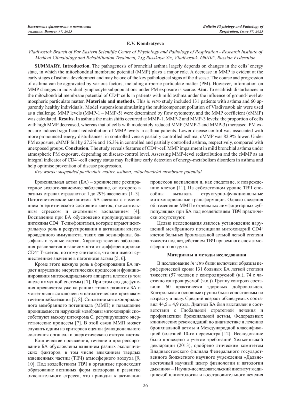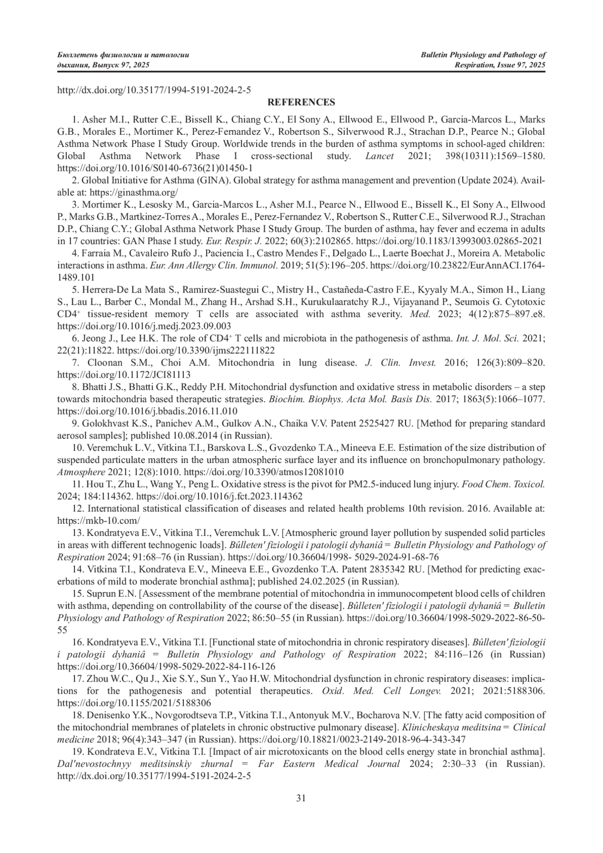 19. Кондратьева Е.В., Виткина Т.И. Влияние микротоксикантов атмосферного воздуха на энергетическое состояние клеток крови при бронхиальной астме // Дальневосточный медицинский журнал. 2024. №2. С.30–33.