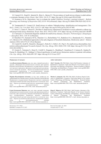 20. Toumpanakis D., Usmani O.S. Small airways in asthma: pathophysiology, identification and management // Chin. Med. J. Pulm. Crit. Care Med. 2023. Vol.1, №3. P.171-180. https:/. DOI: 10.1016/j.pccm.2023.07.002