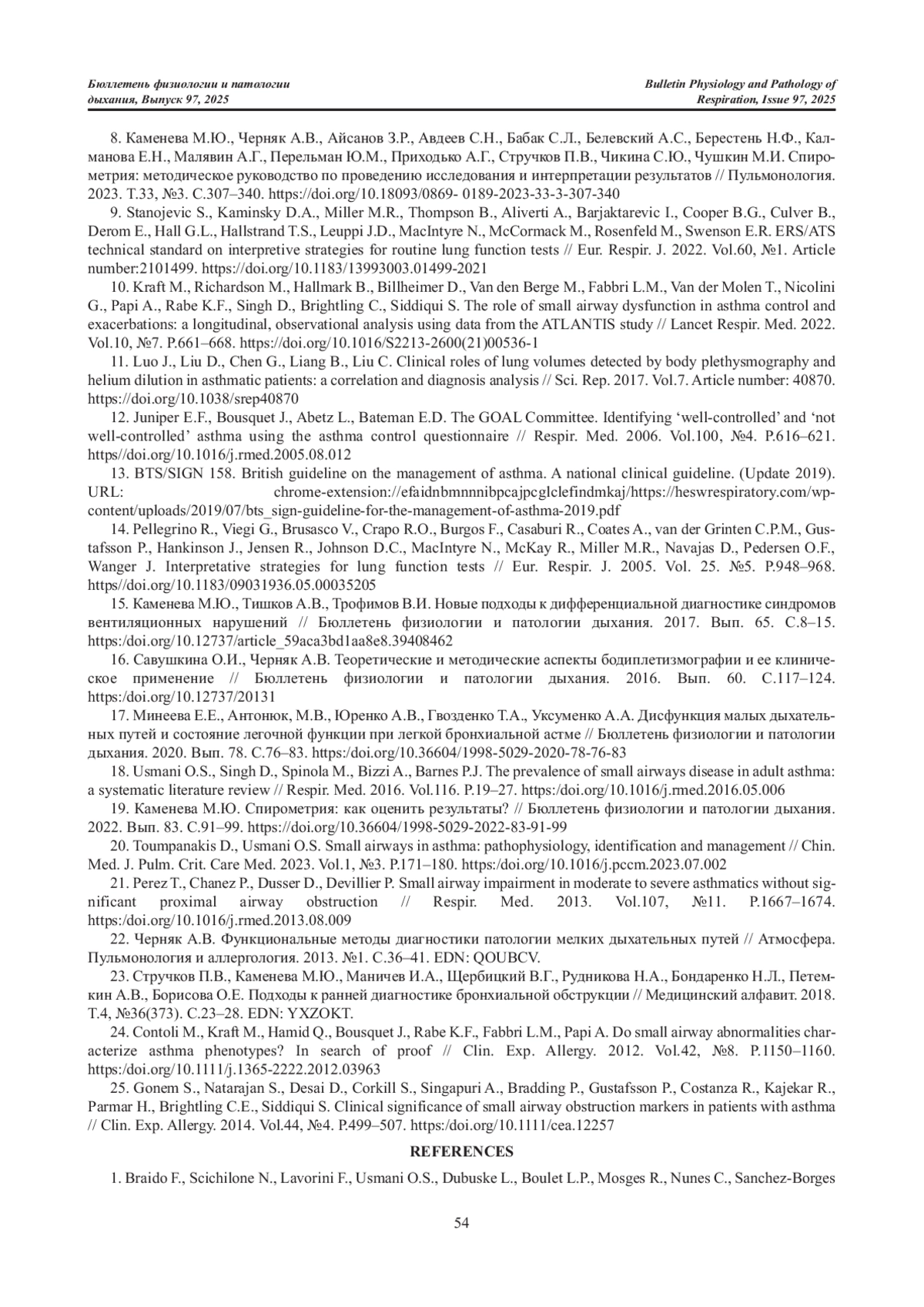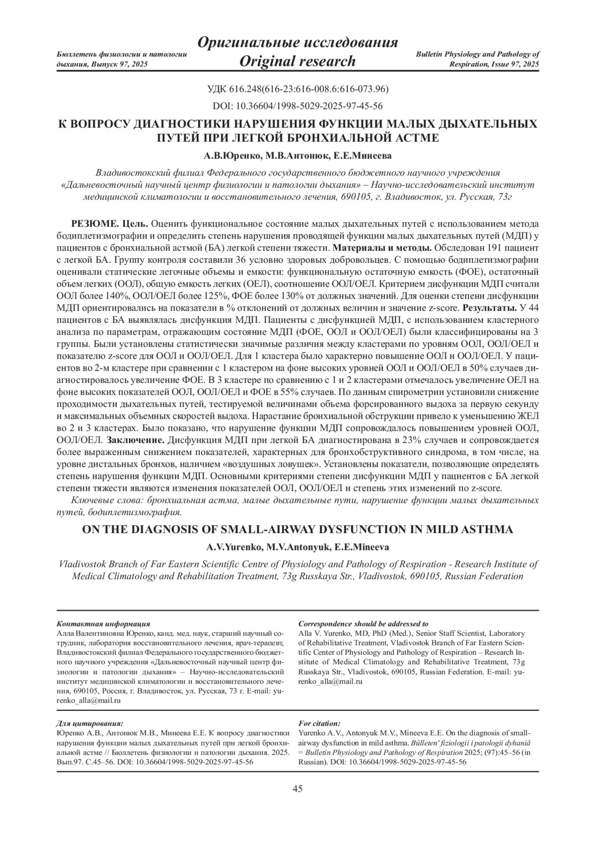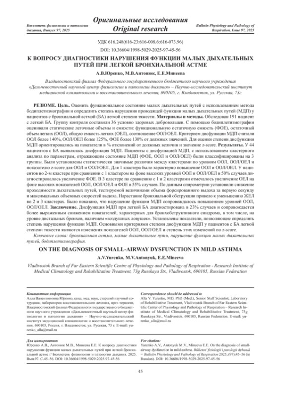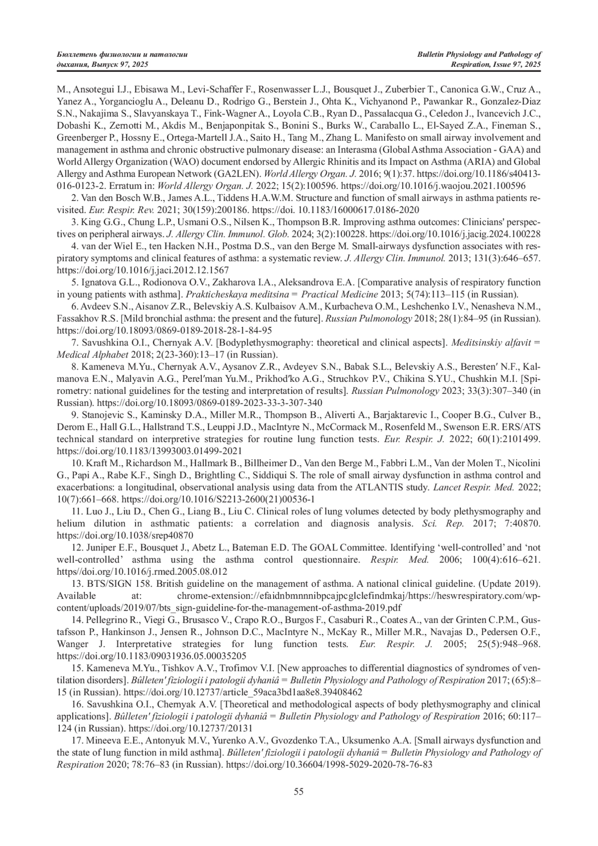17. Минеева Е.Е., Антонюк, М.В., Юренко А.В., Гвозденко Т.А., Уксуменко А.А. Дисфункция малых дыхательных путей и состояние легочной функции при легкой бронхиальной астме // Бюллетень физиологии и патологии дыхания. 2020. Вып. 78. С.76-83. https:/. DOI: 10.36604/1998-5029-2020-78-76-83