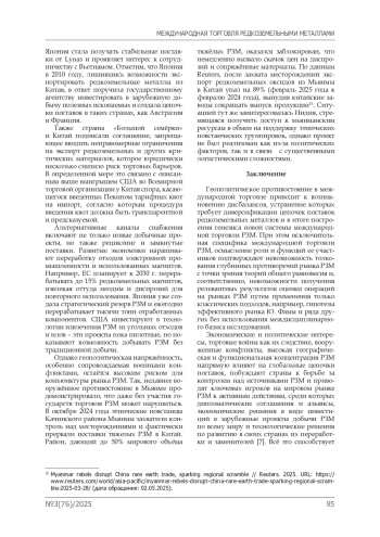 Обсуждение и заключение. Экономические и политические интересы, торговые войны как их следствие, вооруженные конфликты, высокая географическая и функциональная концентрация РЗМ напрямую влияют на глобальные цепочки поставок, побуждают страны к борьбе с целью контроля над источниками РЗМ. Дальнейший рост конкуренции за ресурсы РЗМ приводит к созданию новых производственных мощностей по их добыче и переработке в разных регионах мира, что способствует появлению в перспективе более сбалансированного рынка и формированию многополярной системы международной торговли, ослаблению мировой зависимости от влияния Китая как ведущего поставщика и координирующего центра глобальных поставок РЗМ.