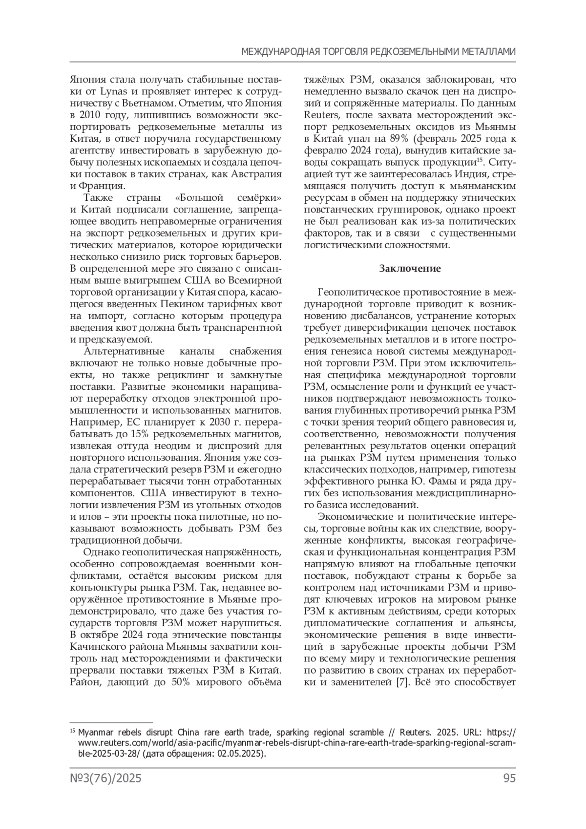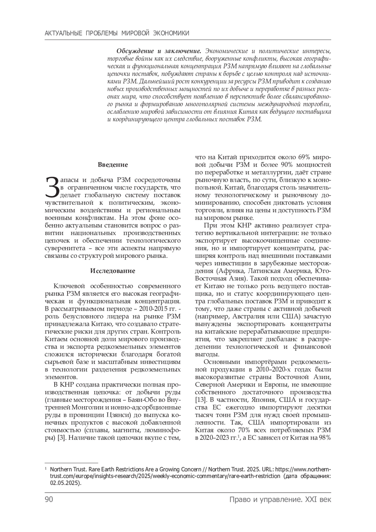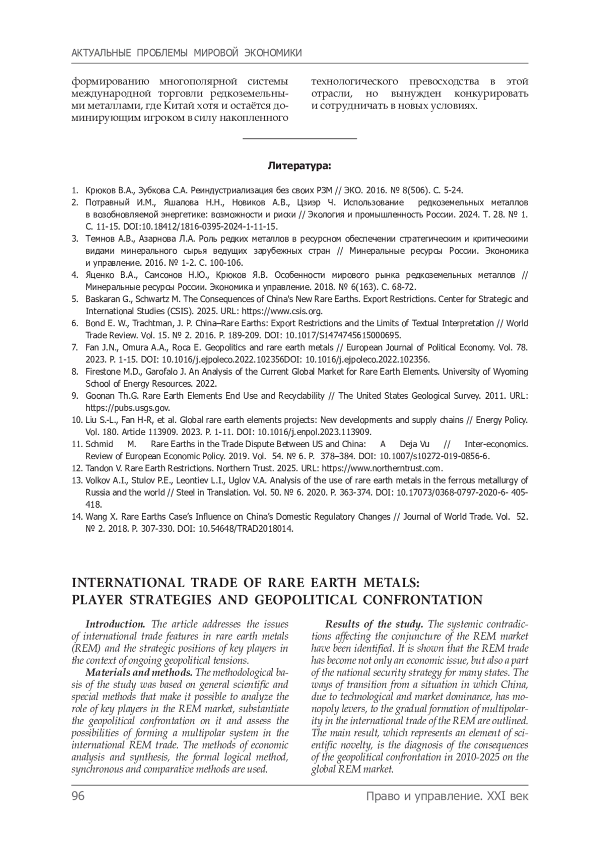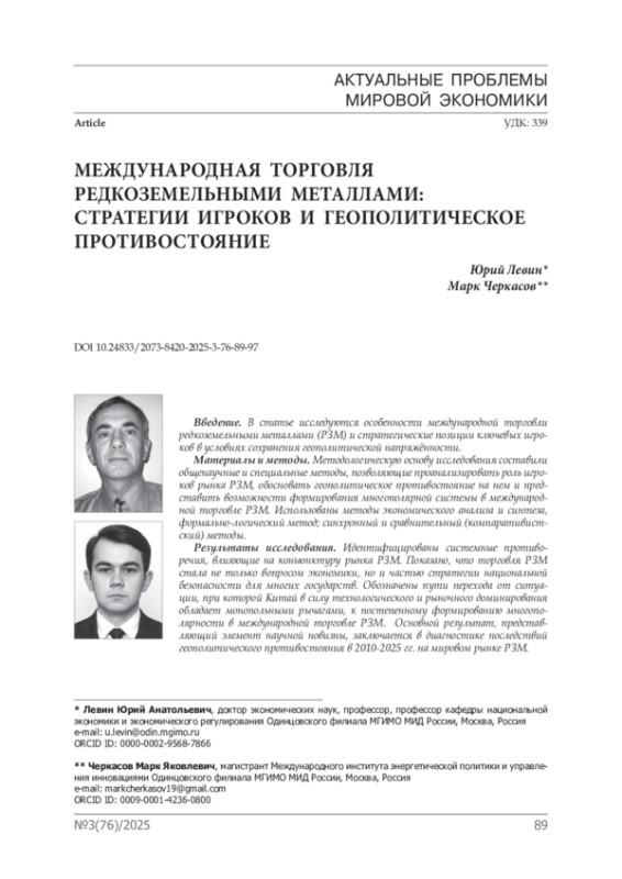 ЧЕРКАСОВ М. Я., ЛЕВИН Ю. А. МЕЖДУНАРОДНАЯ ТОРГОВЛЯ РЕДКОЗЕМЕЛЬНЫМИ МЕТАЛЛАМИ: СТРАТЕГИИ ИГРОКОВ И ГЕОПОЛИТИЧЕСКОЕ ПРОТИВОСТОЯНИЕ // ПРАВО И УПРАВЛЕНИЕ. XXI ВЕК. 2025. ТОМ 21, № 3