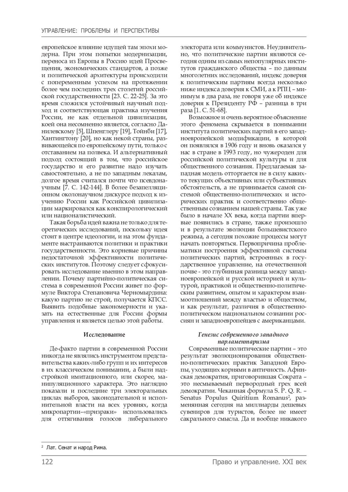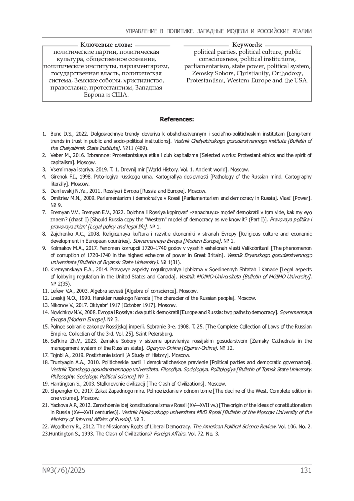 Обсуждение и заключение. Попытки трансформации российского политического сознания, игнорирующие сложившиеся исторические, социокультурные реалии при построении партийной системы, на сегодняшний день не приносят ожидаемых результатов. Более того, ориентация на западные шаблоны уже не раз подрывала стабильность и единство России, что означает вероятность возникновения нового кризиса в будущем, если страна откажется от формирования своего подхода к управлению в политике. Необходимо начать обсуждение возможностей создания новой архитектуры законодательной власти в корне отличной от моделей иной нам Западной цивилизации.