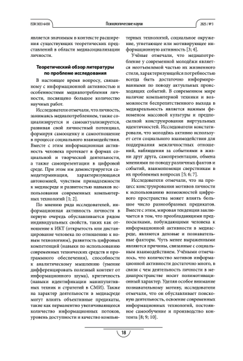Теоретическая и/или практическая значимость. Полученные результаты могут быть учтены в процессе психологического сопровождения процесса медиасоциализации личности.