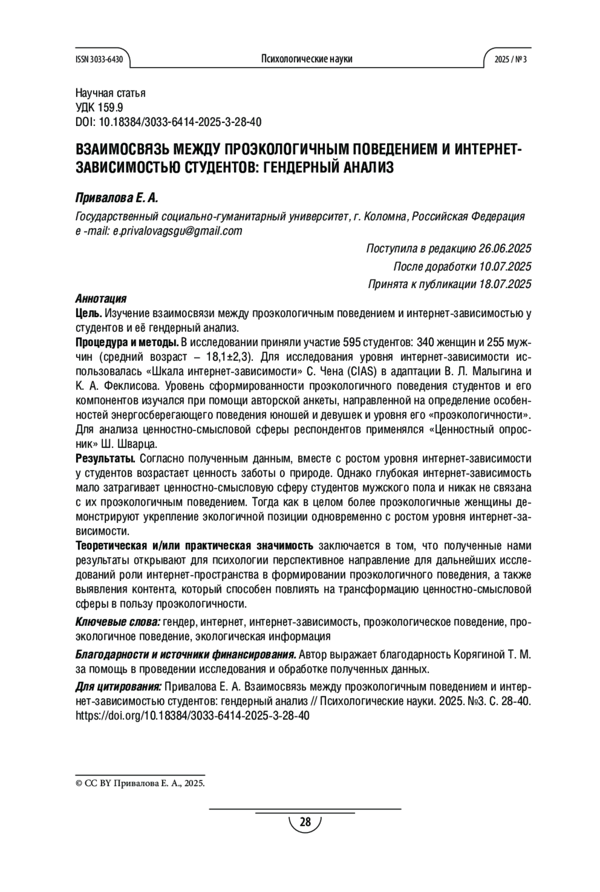 Цель. Изучение взаимосвязи между проэкологичным поведением и интернет-зависимостью у студентов и её гендерный анализ.