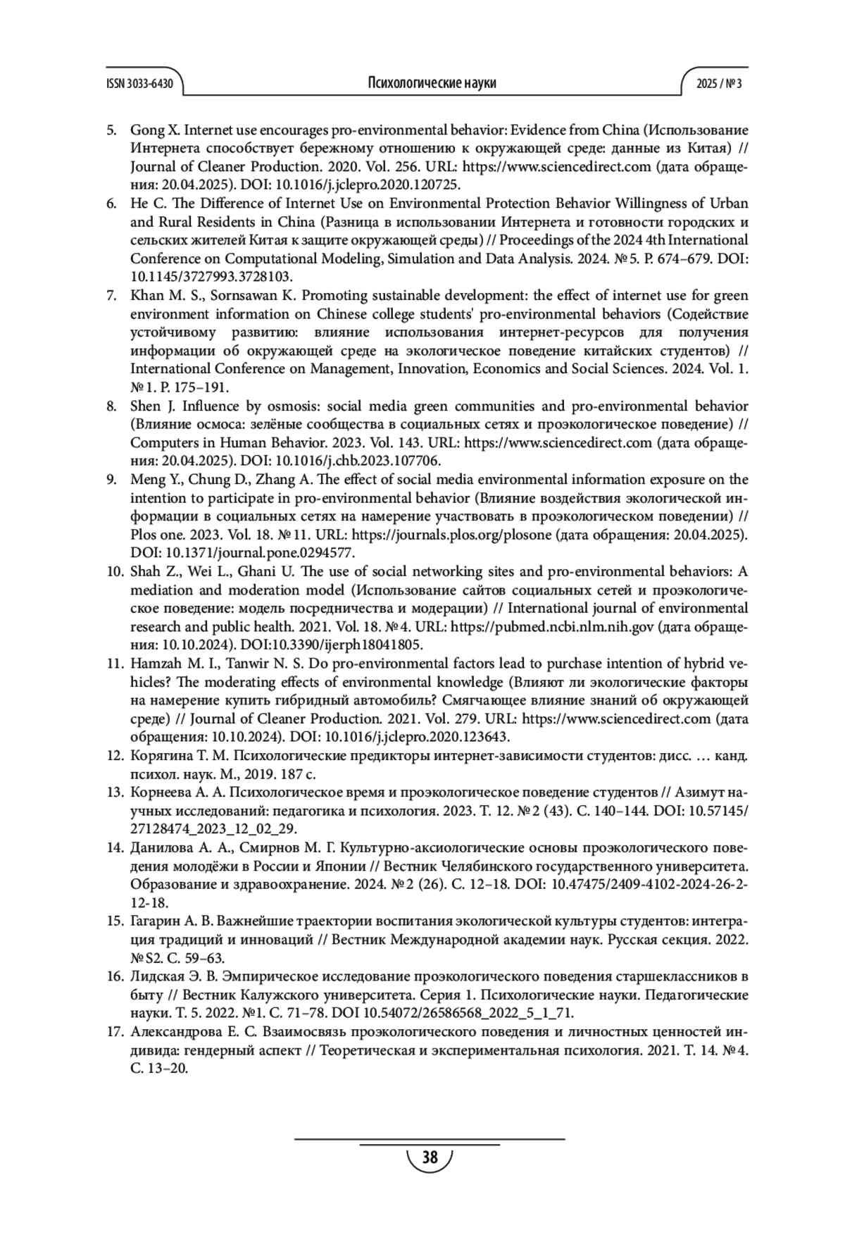 4. Xiao Y., Liu X., Ren T. Internet use and pro-environmental behavior: Evidence from China (Использование Интернета и экологичное поведение: данные из Китая) // Plos one. 2022. Vol. 17. № 1. URL: https://journals.plos.org/plosone (дата обращения: 20.04.2025). https://doi.org/10.1371/journal.pone.0262644.