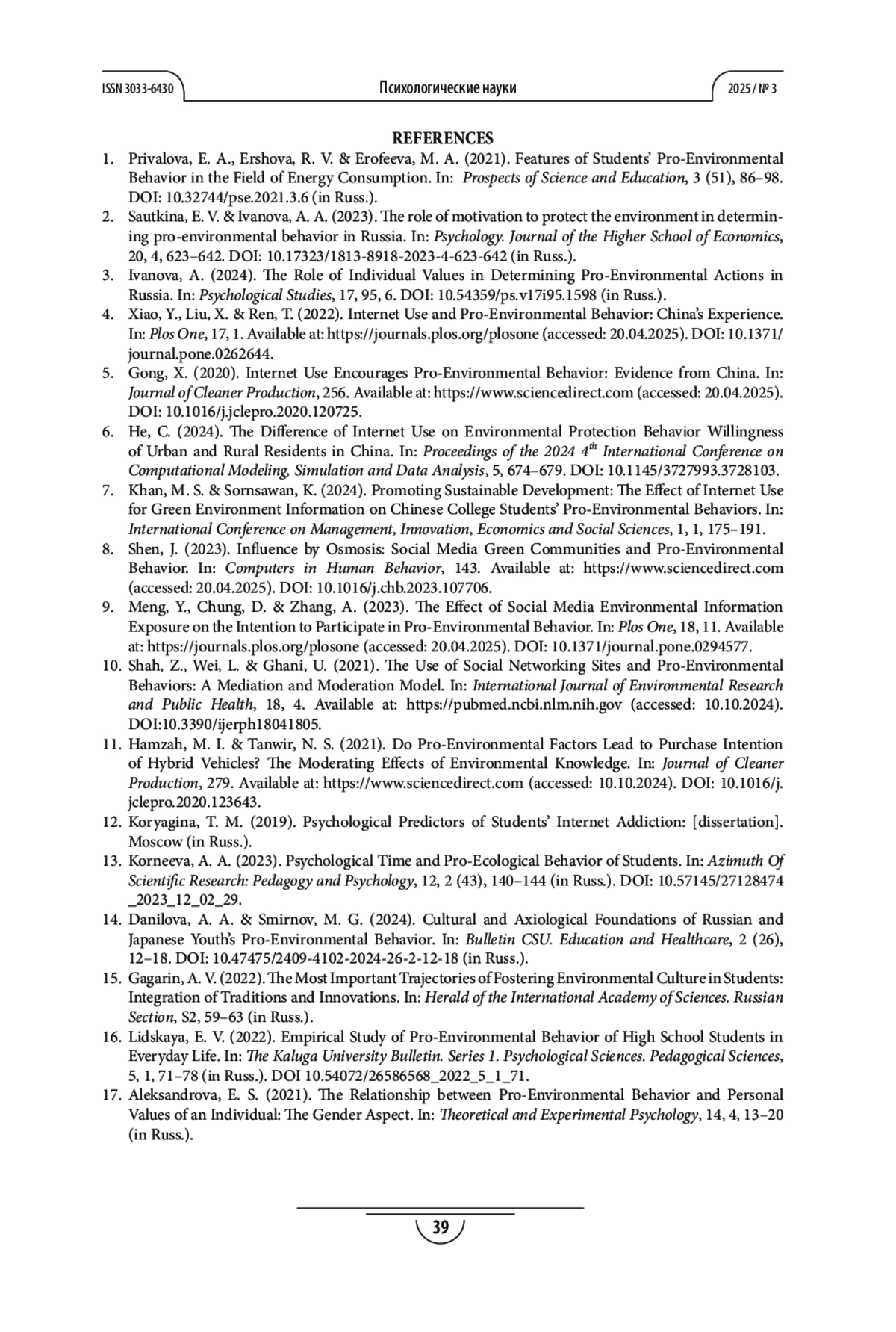 3. Иванова А. Роль индивидуальных ценностей в определении проэкологических действий в России // Психологические исследования. 2024. Т. 17. №95. С. 6. https://doi.org/10.54359/ps.v17i95.1598.