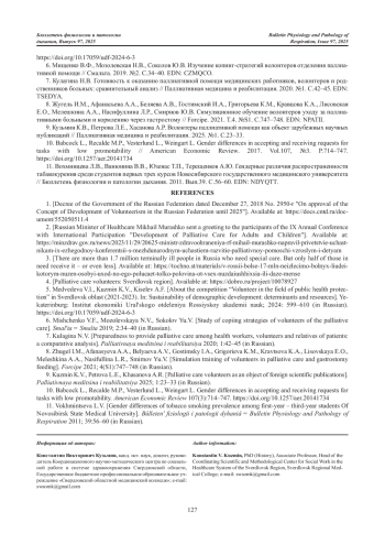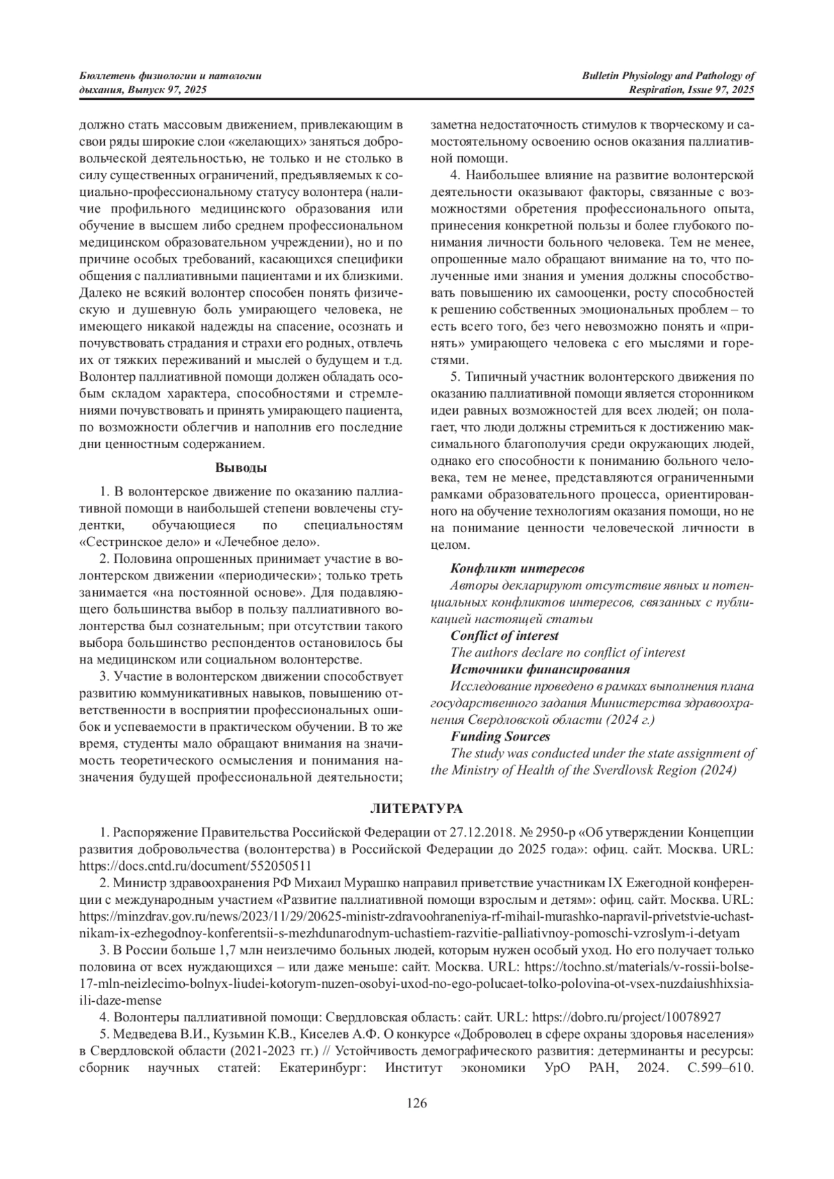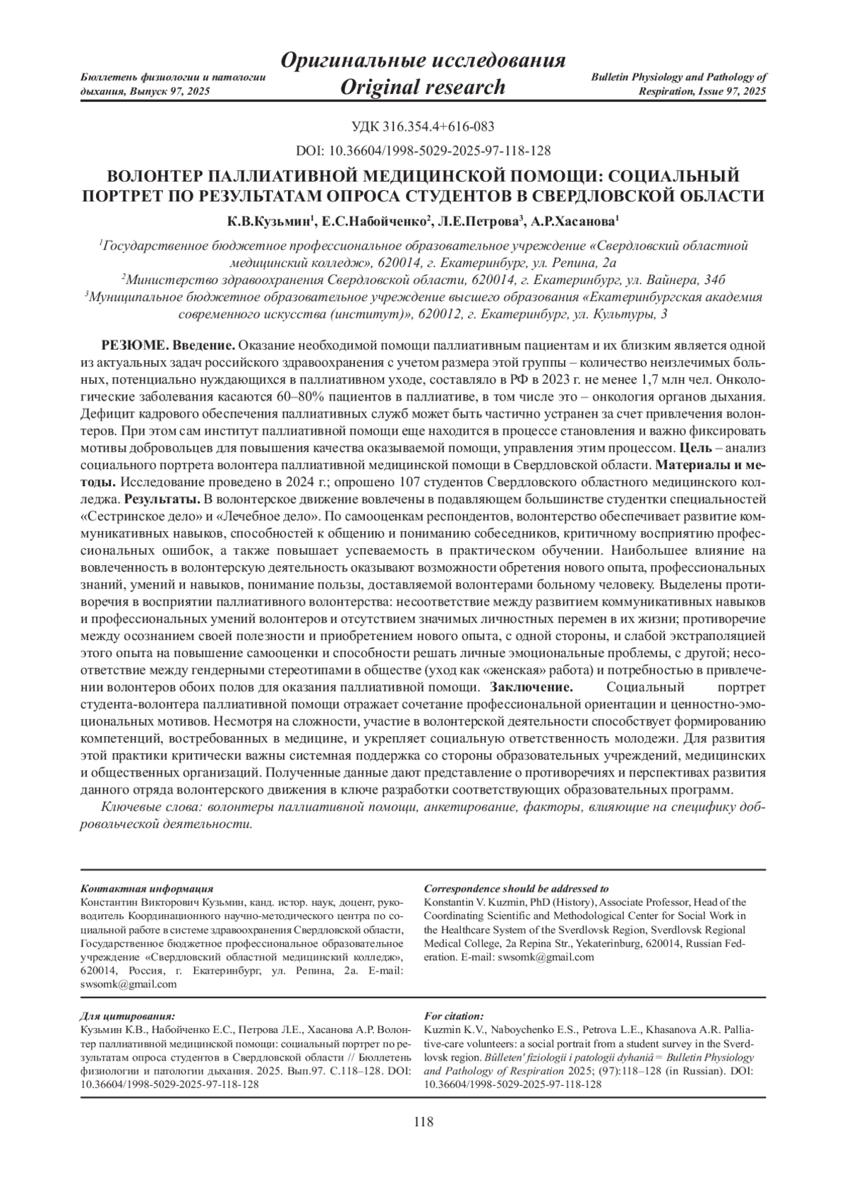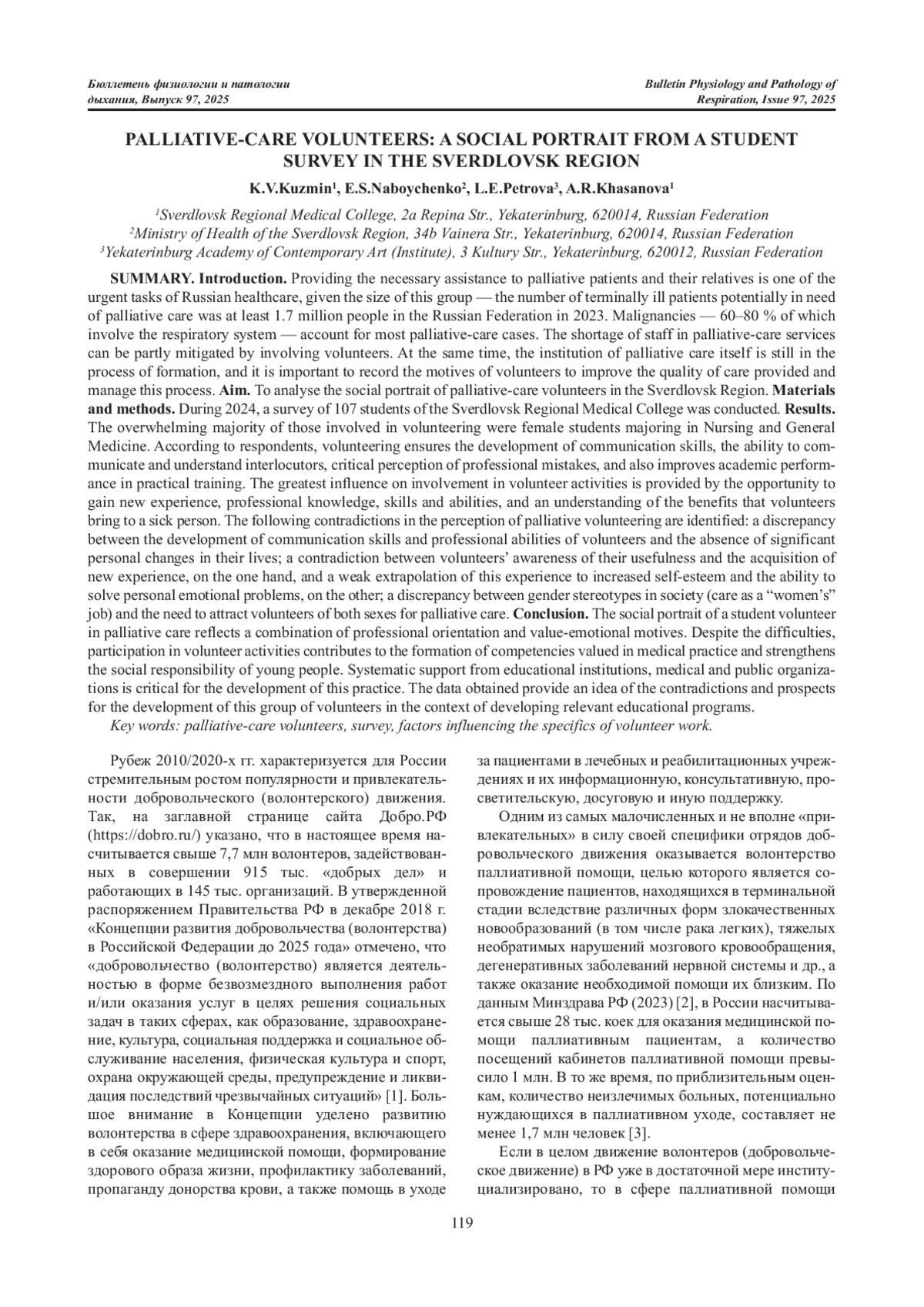 КУЗЬМИН К. В., НАБОЙЧЕНКО Е. С., ПЕТРОВА Л. Е., ХАСАНОВА А. Р. ВОЛОНТЕР ПАЛЛИАТИВНОЙ МЕДИЦИНСКОЙ ПОМОЩИ: СОЦИАЛЬНЫЙ ПОРТРЕТ ПО РЕЗУЛЬТАТАМ ОПРОСА СТУДЕНТОВ В СВЕРДЛОВСКОЙ ОБЛАСТИ // БЮЛЛЕТЕНЬ ФИЗИОЛОГИИ И ПАТОЛОГИИ ДЫХАНИЯ. 2025. № 97
