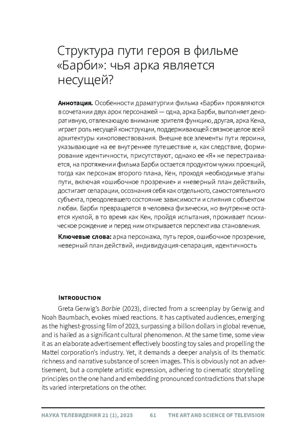 Особенности драматургии фильма «Барби» проявляются в сочетании двух арок персонажей - одна, арка Барби, выполняет декоративную, отвлекающую внимание зрителя функцию, другая, арка Кена, играет роль несущей конструкции, поддерживающей связное целое всей архитектуры киноповествования. Внешне все элементы пути героини, указывающие на ее внутреннее путешествие и, как следствие, формирование идентичности, присутствуют, однако ее «Я» не перестраивается, на протяжении фильма Барби остается продуктом чужих проекций, тогда как персонаж второго плана, Кен, проходя необходимые этапы пути, включая «ошибочное прозрение» и «неверный план действий», достигает сепарации, осознания себя как отдельного, самостоятельного субъекта, преодолевшего состояние зависимости и слияния с объектом любви. Барби превращается в человека физически, но внутренне остается куклой, в то время как Кен, пройдя испытания, проживает психическое рождение и перед ним открывается перспектива становления.