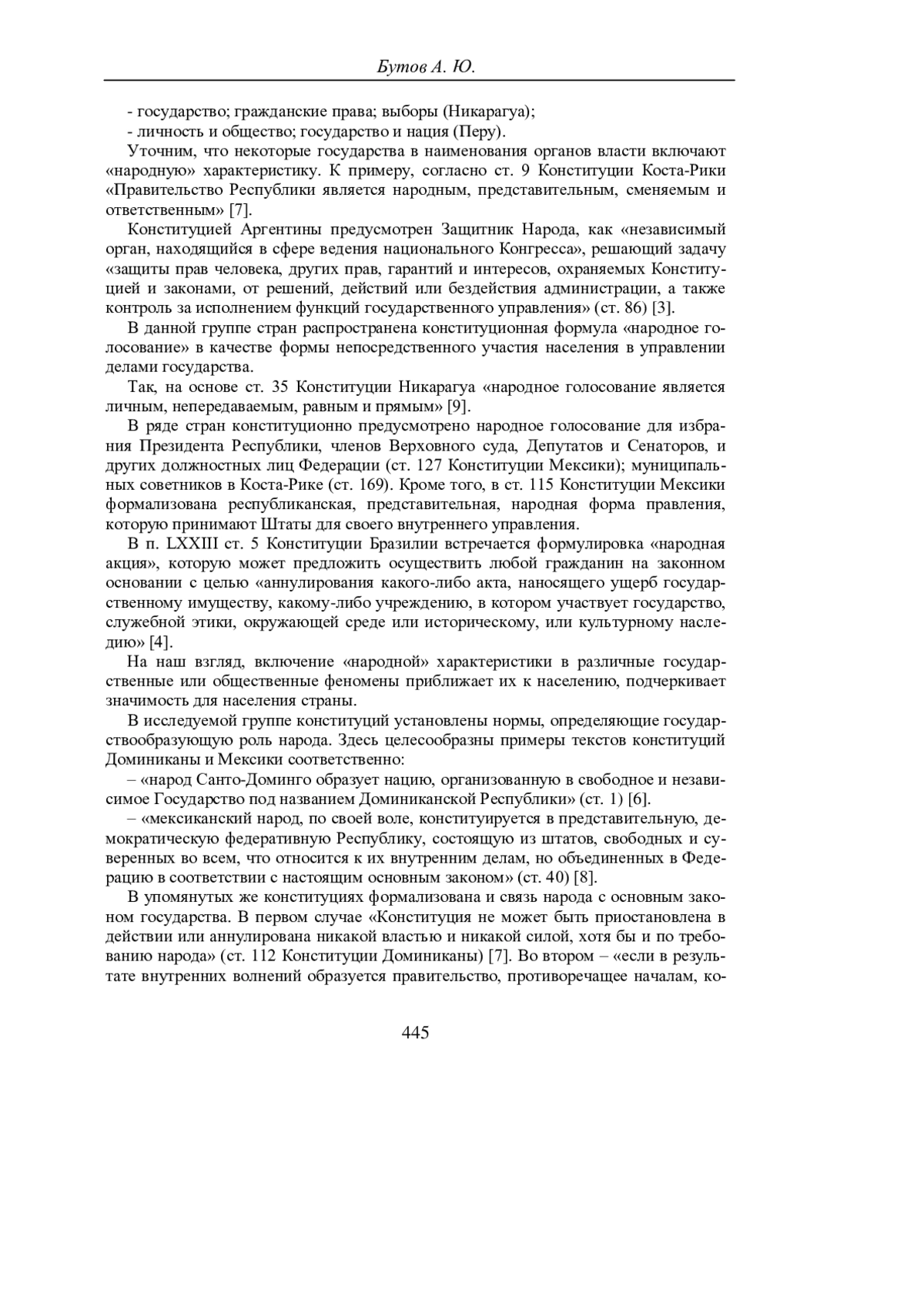БУТОВ А. Ю. ФОРМАЛИЗАЦИЯ КАТЕГОРИИ «НАРОД» В КОНСТИТУЦИЯХ СТРАН ЛАТИНСКОЙ АМЕРИКИ // УЧЕНЫЕ ЗАПИСКИ КРЫМСКОГО ФЕДЕРАЛЬНОГО УНИВЕРСИТЕТА ИМЕНИ В. И. ВЕРНАДСКОГО. ЮРИДИЧЕСКИЕ НАУКИ. 2025. ТОМ 11(77). №1