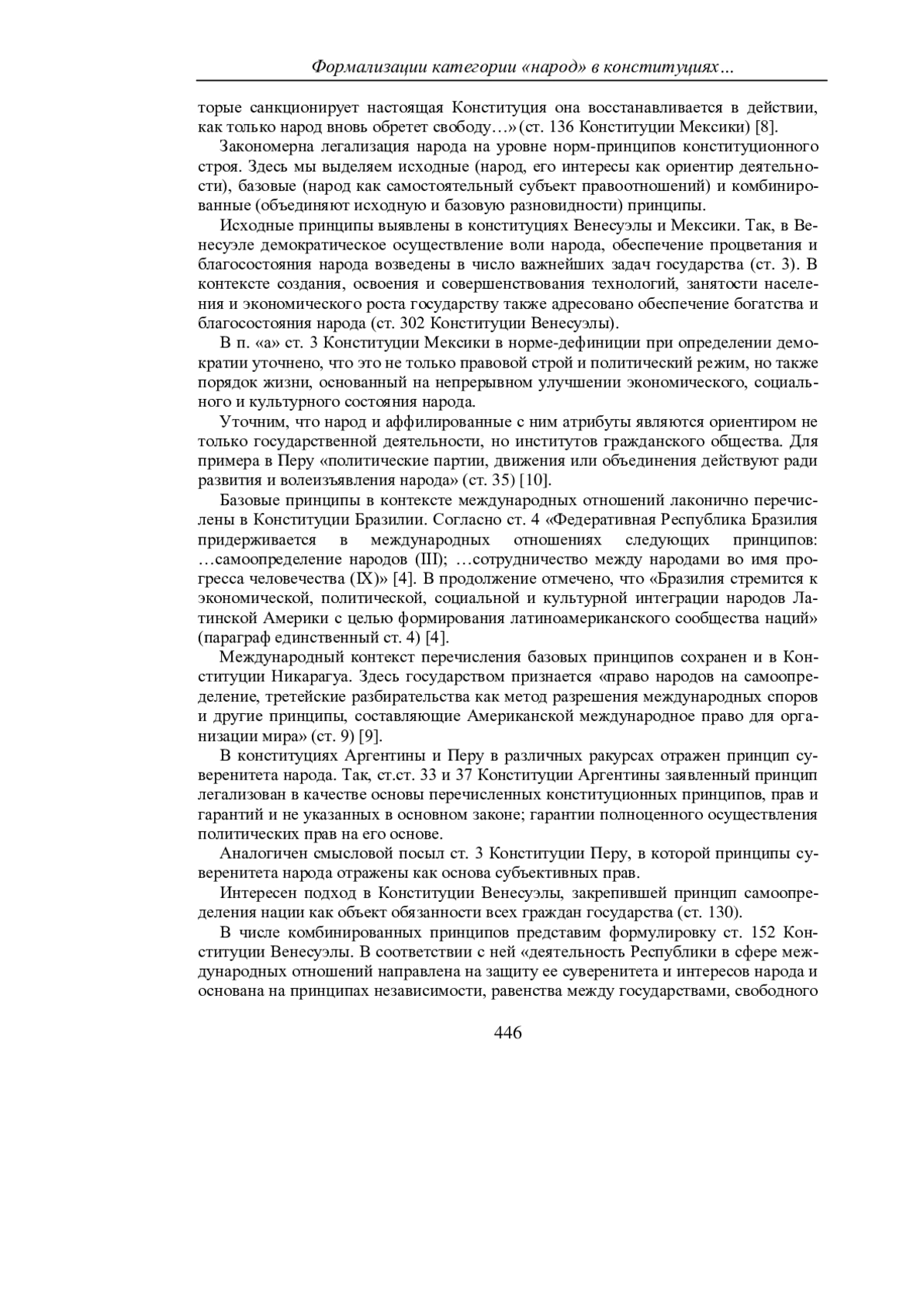 В данной статье на основе сравнительно-правового метода осуществлен анализ текстов конституцией стран Латинской Америки с целью выявления в них норм, формализующих народ как субъект правоотношений. К числу полученных результатов исследования отнесен тезис о: легализации народа в пространственном и национальном измерениях в различных частях конституций, начиная от общих принципов организации государства, до внесения конституционных изменений. Многочисленны нормы-принципы в исходной, базовой и комбинированной разновидностях, адресованных народу. Установлено, что принцип народовластия опосредует конкретизирующие конституционные нормы, связанные с представителями народа во власти. При этом, конституционные полномочия различных властных структур сопряжены не только с интересами народа, но и с конкретными действиями, предполагающими участие народа. Исключительность народа, как конституционного субъекта правоотношений подчеркивается легализацией отдельных элементов его правового статуса, включая государственное гарантирование субъективных прав.