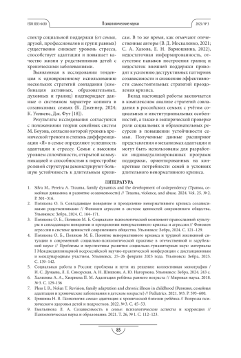 1. Silva M., Pereira A. Trauma, family dynamics and the development of codependency (Травма, семейная динамика и развитие созависимости) // Trauma, violence, and abuse. 2024. Vol. 25. № 2. P. 301-316.