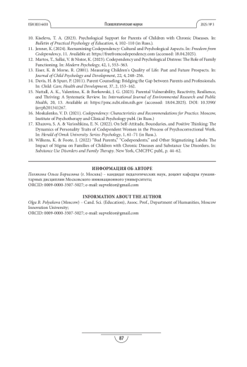 12. Martos T., Sallai V., Nistor K. Codependency and Psychological Distress: The Role of Family Functioning (Созависимость и психологический дистресс: роль функционирования семьи). // Modern psychology. 2023. Vol. 42. № 1. P. 553-563.