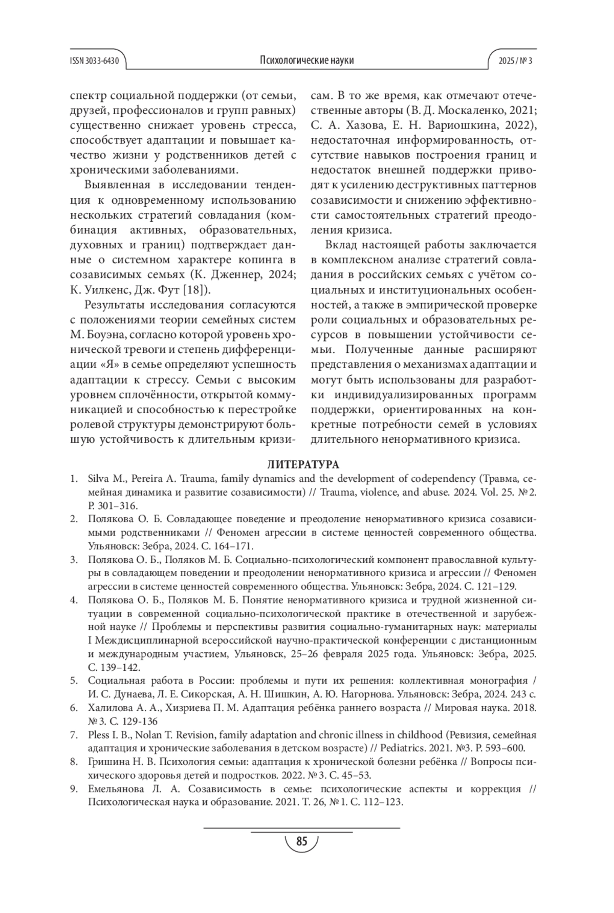 9. Емельянова Л. А. Созависимость в семье: психологические аспекты и коррекция // Психологическая наука и образование. 2021. Т. 26, № 1. С. 112-123.