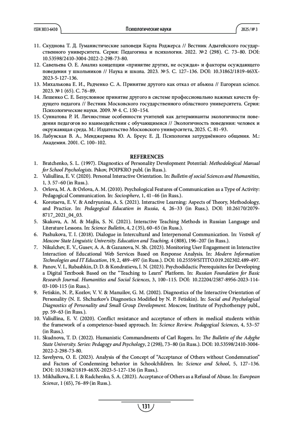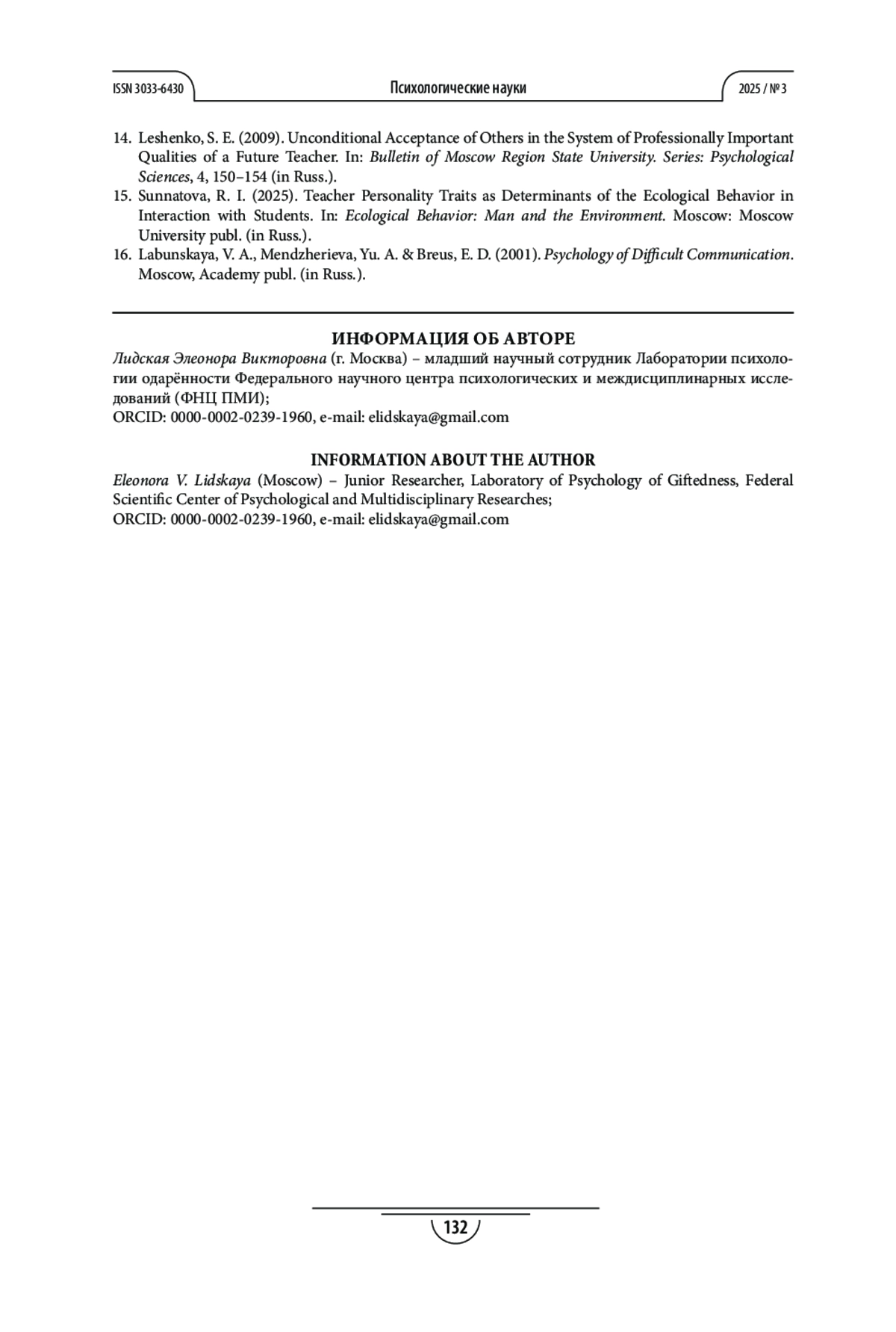 14. Лешенко С. Е. Безусловное принятие другого в системе профессионально важных качеств будущего педагога // Вестник Московского государственного областного университета. Серия: Психологические науки. 2009. № 4. С. 150-154.