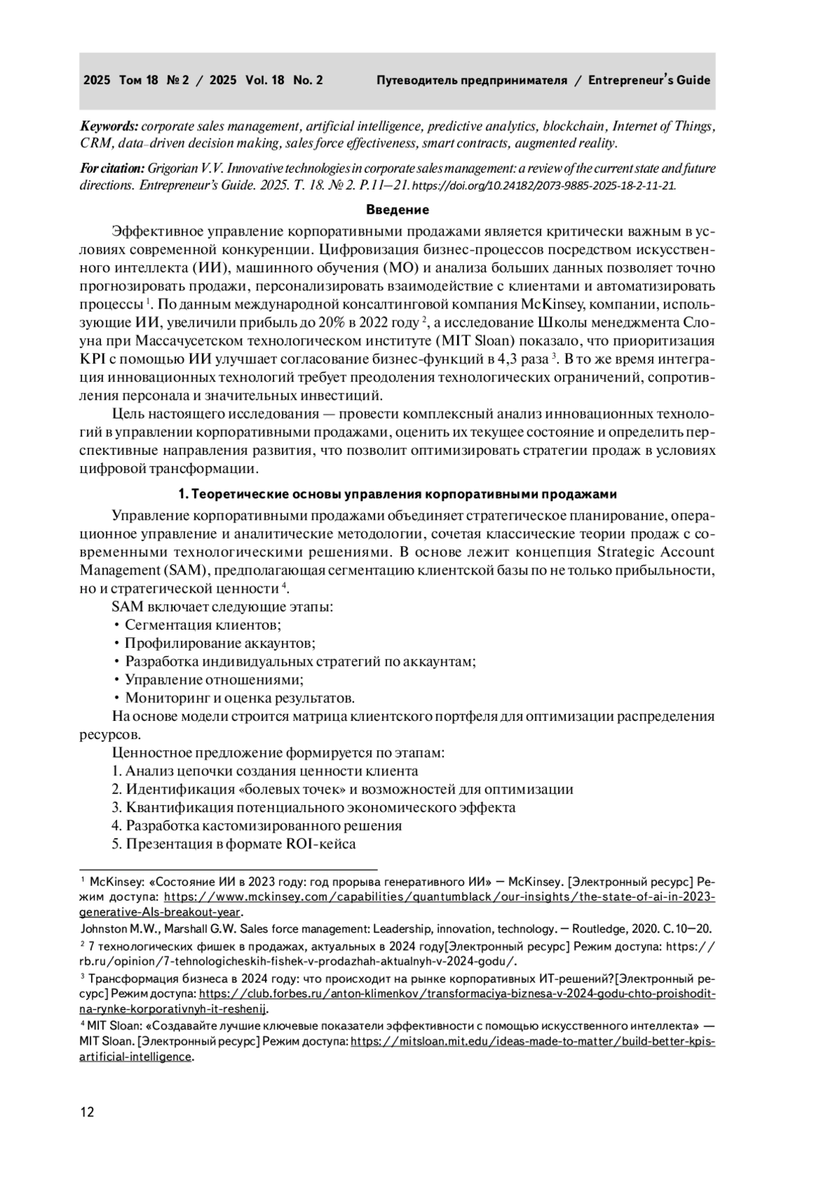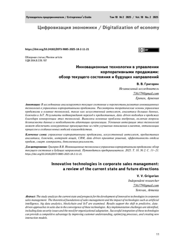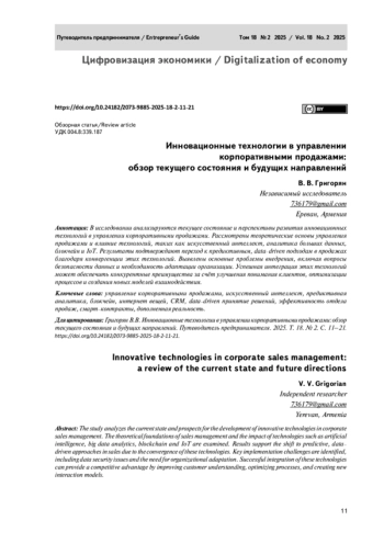 В исследовании анализируются текущее состояние и перспективы развития инновационных технологий в управлении корпоративными продажами. Рассмотрены теоретические основы управления продажами и влияние технологий, таких как искусственный интеллект, аналитика больших данных, блокчейн и IoT. Результаты подтверждают переход к предиктивным, data–driven подходам в продажах благодаря конвергенции этих технологий. Выявлены основные проблемы внедрения, включая вопросы безопасности данных и необходимость адаптации организации. Успешная интеграция этих технологий может обеспечить конкурентные преимущества за счёт улучшения понимания клиентов, оптимизации процессов и создания новых моделей взаимодействия.