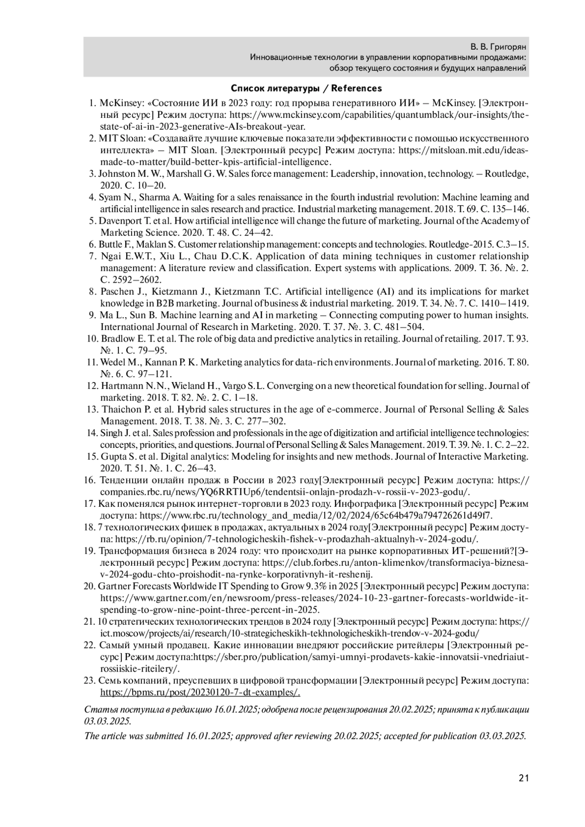 14. Singh J. et al. Sales profession and professionals in the age of digitization and artificial intelligence technologies: concepts, priorities, and questions. Journal of Personal Selling & Sales Management. 2019. Т. 39. №. 1. С. 2-22.