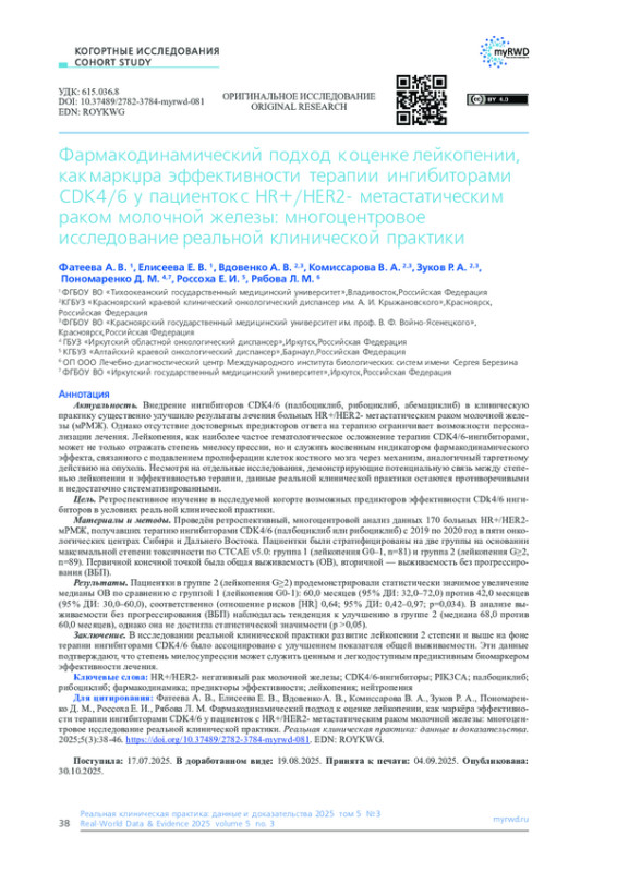 16. Фатеева А. В., Зуков Р. А. Поиск предикторов эффективности лечения ингибиторами CDK4/6 у пациенток с HR+/HER2-метастатическим раком молочной железы // Онкология. Журнал им. П.А. Герцена. 2023;12(3):34-41. EDN: MYFLRU