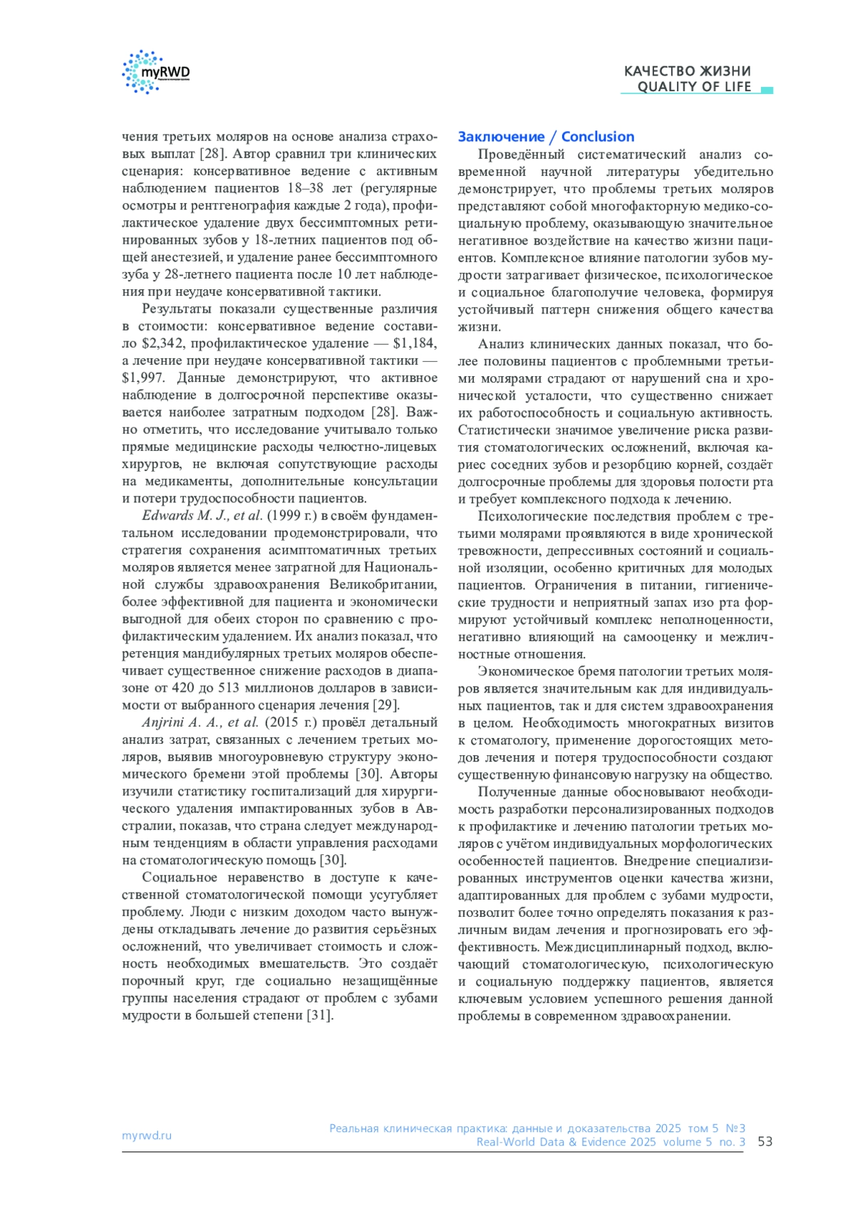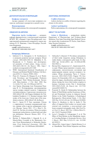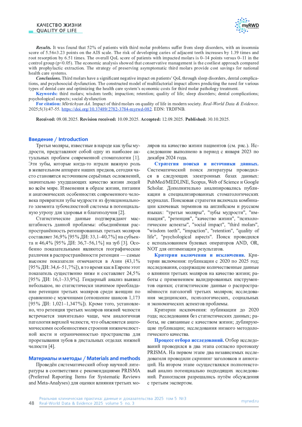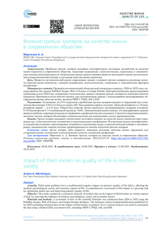 МКРТИЧЯН А. А. ВЛИЯНИЕ ТРЕТЬИХ МОЛЯРОВ НА КАЧЕСТВО ЖИЗНИ В СОВРЕМЕННОМ ОБЩЕСТВЕ // РЕАЛЬНАЯ КЛИНИЧЕСКАЯ ПРАКТИКА: ДАННЫЕ И ДОКАЗАТЕЛЬСТВА. 2025. № 3, ТОМ 5