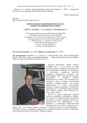 Николай Николаевич Цвелёв родился 31 января 1925 г. и стал одной из самых значимых фигур российской систематики XX века: выдающийся специалист по флористике и систематике сосудистых растений, сотрудник Ботанического института им. В. Л. Комарова РАН, автор фундаментальных монографий и редактор крупных флористических сводок. Его научный путь охватывает более полувека интенсивной полевой и гербарной работы, и по многим направлениям он оставил непреходящее наследие, которым продолжают пользоваться исследователи и в настоящее время (Geltman, 2015; Saksonov, Senator, 2015; Geltman et al., 2016; Tatanov, 2019).