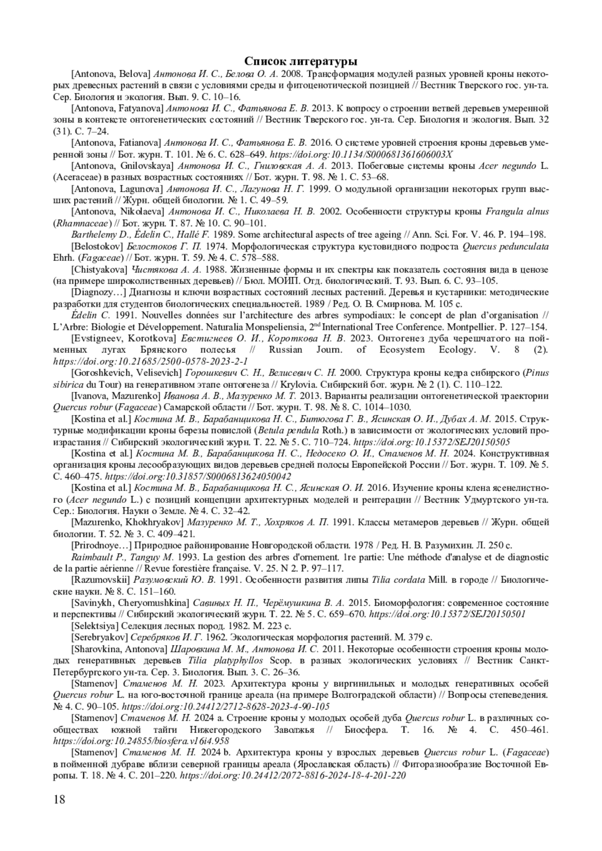 1. Антонова И. С., Белова О. А. 2008. Трансформация модулей разных уровней кроны некоторых древесных растений в связи с условиями среды и фитоценотической позицией // Вестник Тверского гос. ун-та. Сер. Биология и экология. Вып. 9. С. 10-16.