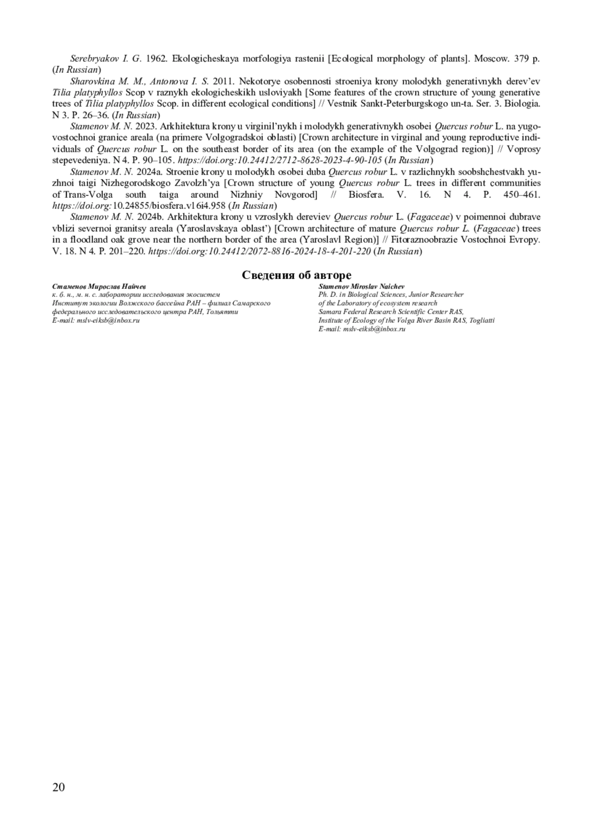 28. Стаменов М. Н. 2024 b. Архитектура кроны у взрослых деревьев Quercus robur L. (Fagaceae) в пойменной дубраве вблизи северной границы ареала (Ярославская область) // Фиторазнообразие Восточной Европы. Т. 18. № 4. С. 201-220. https://doi.org:.
