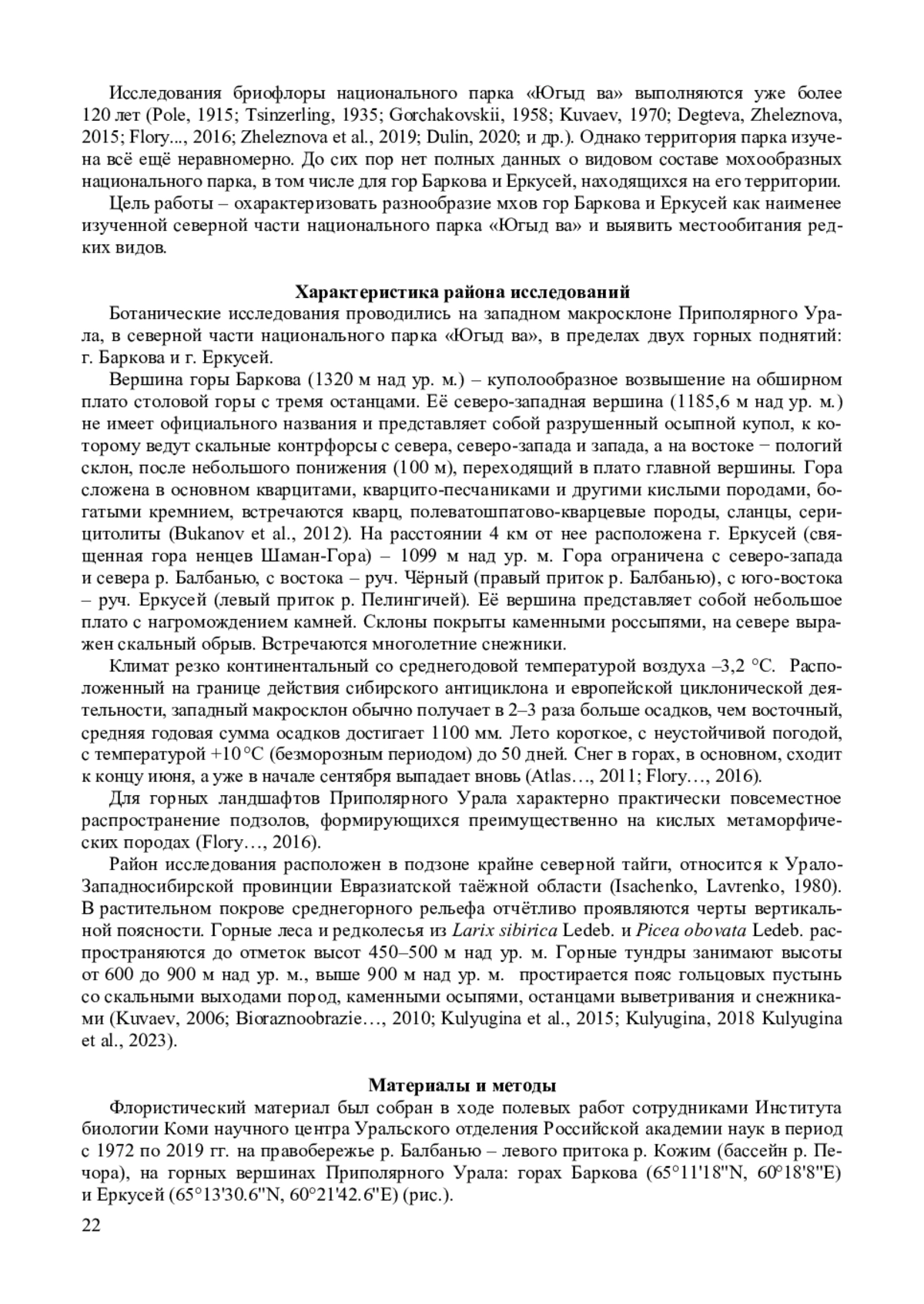 18. Кулюгина Е. Е., Тетерюк Л. В., Тетерюк Б. Ю. 2023. Флора сосудистых растений горы Баркова (Приполярный Урал) и её роль в сохранении редких видов // Тр. КарНЦ РАН. Сер. Биогеография. № 1. С. 64-77. DOI: 10.17076/bg1542