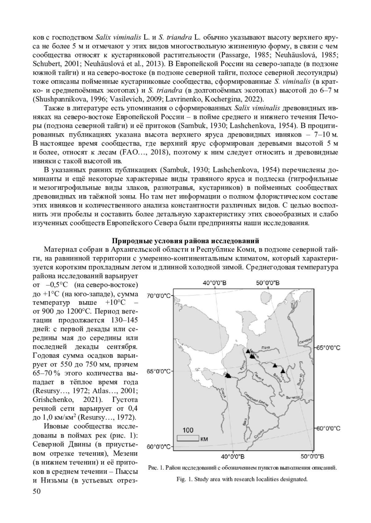 Сообщества с верхним ярусом, сформированным аллювиальными видами ив, – харак-терный компонент пойменной растительности Евразии (Horvat et al., 1974; Lipatova, 1980; Rastitel’nyi…, 1985; Golub, 1999; Akhtiamov, 2001; Vasilevich, 2009; Efimova, 2009; Mucina et al., 2016; Neshataev et al., 2022; и др.). В поймах равнинных рек Европы широко известны леса, сформированные аллювиальными ивами Salix alba L., S. fragilis L., S. purpurea L. (Horvat et al., 1974; Novikova et al., 2000; Schubert, 2001; Neuhäuslová et al., 2013; Bulokhov, Semenishchenkov, 2015; Pielech, 2015; Mucina et al., 2016; Golub, Bondareva, 2017). Но ареа-лы этих видов и формируемых ими сообществ не распространяются на северо-восток Евро-пейской России (Arealy…, 1977).