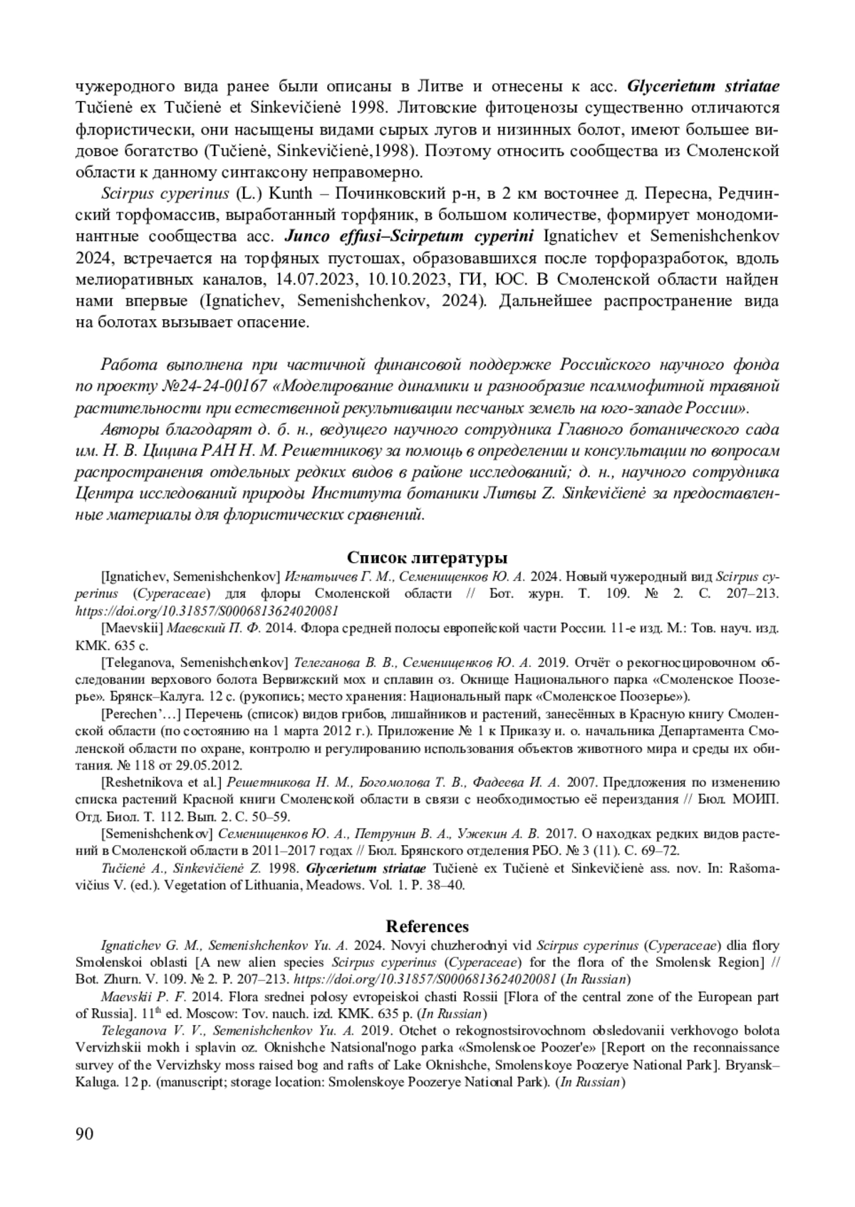 1. Игнатьичев Г. М., Семенищенков Ю. А. 2024. Новый чужеродный вид Scirpus cyperinus (Cyperaceae) для флоры Смоленской области // Бот. журн. Т. 109. № 2. С. 207-213. DOI: 10.31857/S0006813624020081