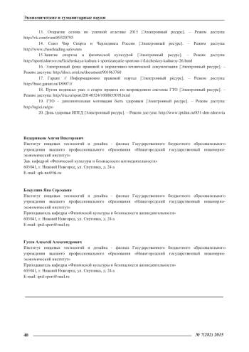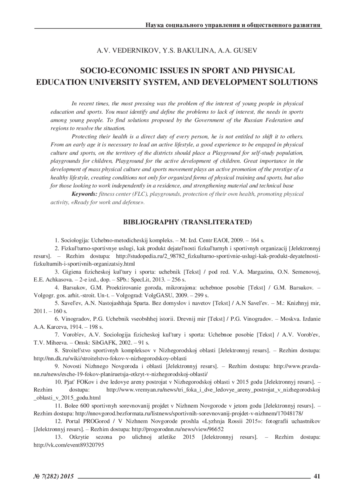 ВЕДЕРНИКОВ А. В., БАКУЛИНА Я. С., ГУСЕВ А. А. СОЦИАЛЬНО-ЭКОНОМИЧЕСКИЕ ПРОБЛЕМЫ В ОБЛАСТИ СПОРТА И ФИЗИЧЕСКОЙ КУЛЬТУРЫ СИСТЕМЫ ВУЗА, ПУТИ РЕШЕНИЯ И РАЗВИТИЯ // ЭКОНОМИЧЕСКИЕ И ГУМАНИТАРНЫЕ НАУКИ. 2015. № 7 (282)