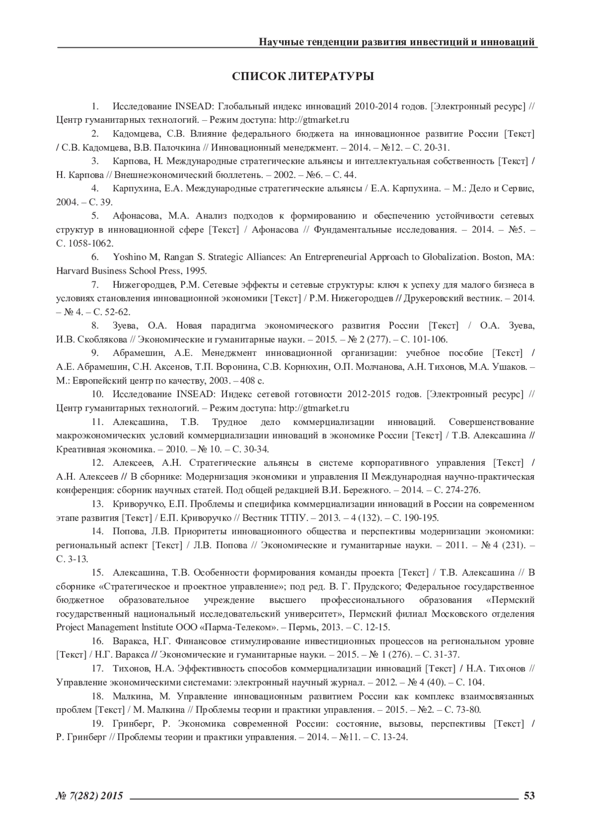 3. Карпова, Н. Международные стратегические альянсы и интеллектуальная собственность /Н. Карпова//Внешнеэкономический бюллетень. -2002. -№6. -С. 44.