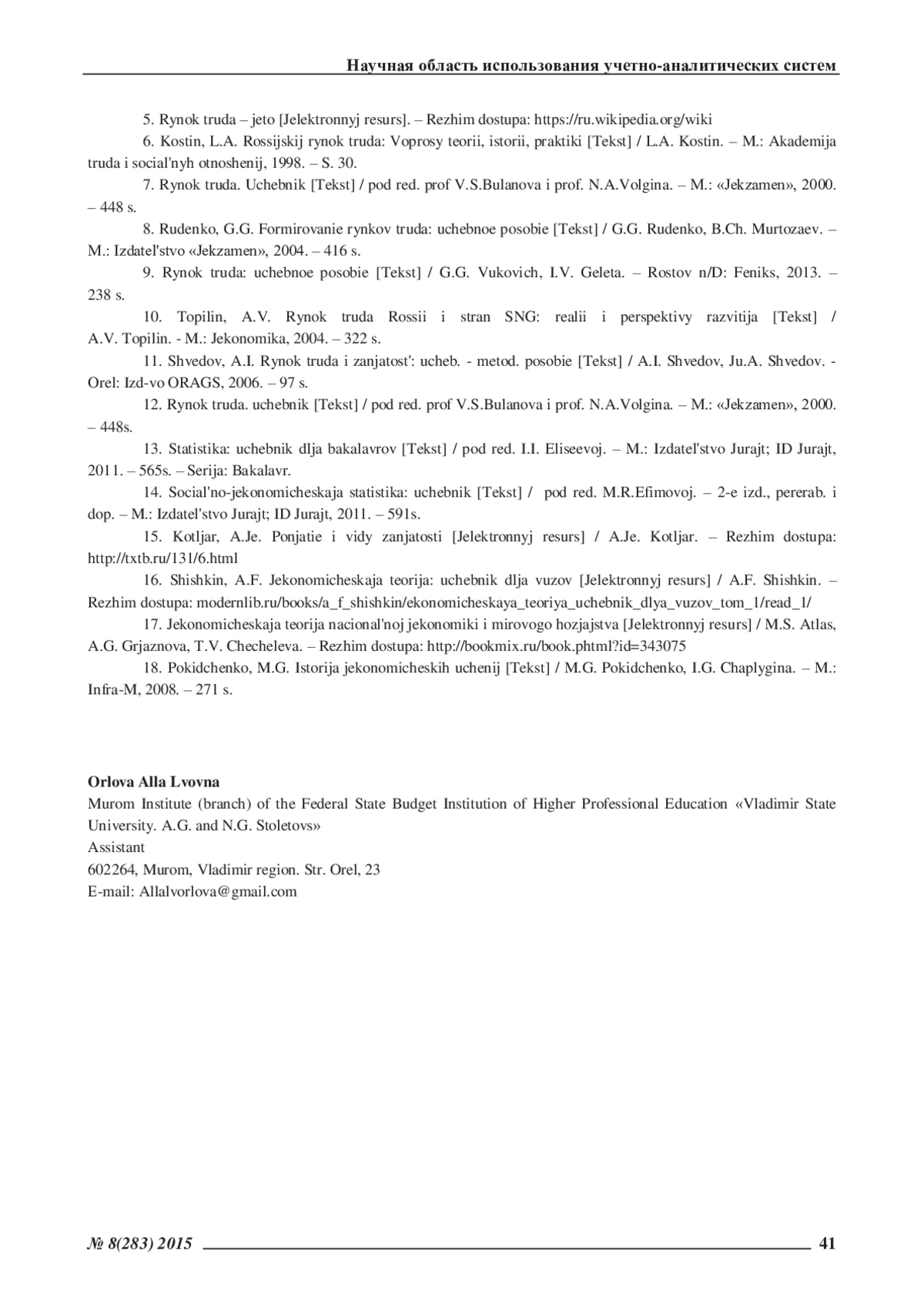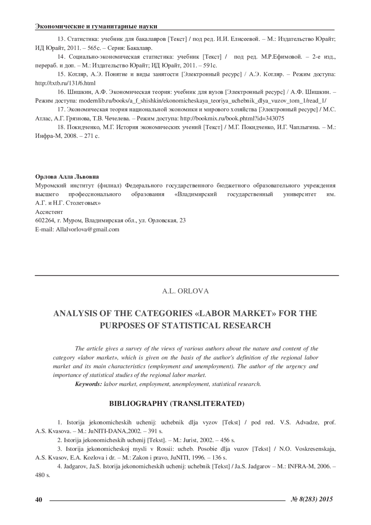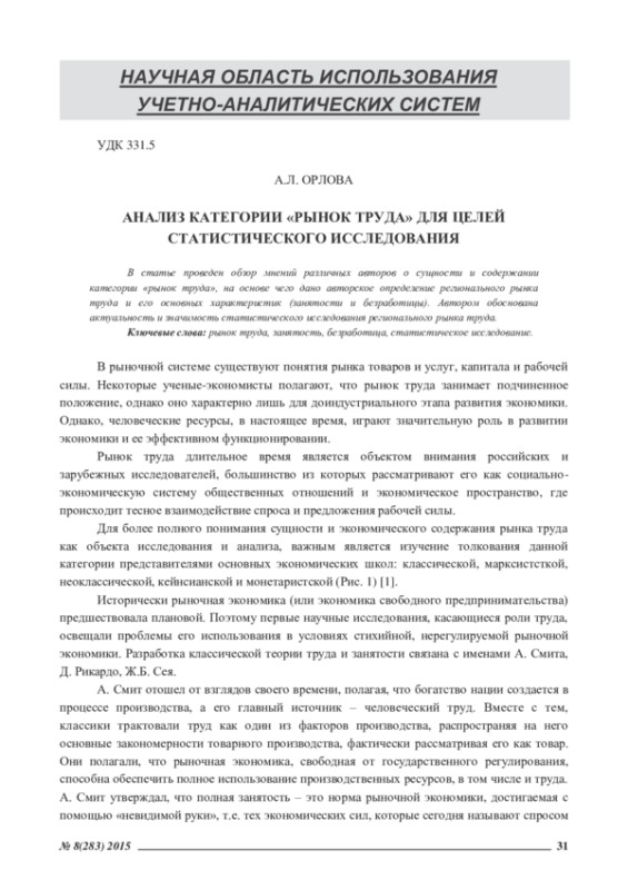 ОРЛОВА А. Л. АНАЛИЗ КАТЕГОРИИ "РЫНОК ТРУДА" ДЛЯ ЦЕЛЕЙ СТАТИСТИЧЕСКОГО ИССЛЕДОВАНИЯ // ЭКОНОМИЧЕСКИЕ И ГУМАНИТАРНЫЕ НАУКИ. 2015. № 8 (283)