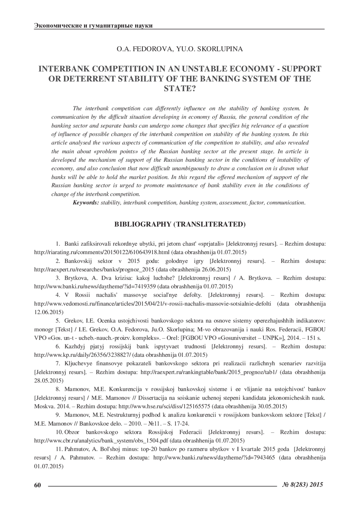 16. Федорова, О.А. Об обеспечении устойчивости банковского сектора в условиях санкций и контексте достижения финансовой безопасности [Текст] / О.А. Федорова, Ю.О. Скорлупина // Национальные интересы: приоритеты и безопасность. - 2015. - №16. - С. 57-67. EDN: TPUWAX