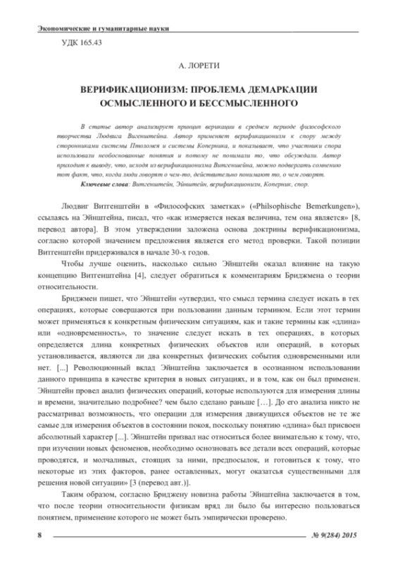 В статье автор анализирует принцип верикации в среднем периоде философского творчества Людвига Вигенштейна. Автор применяет верификационизм к спору между сторонниками системы Птоломея и системы Коперника, и показывает, что участники спора использовали необоснованные понятия и потому не понимали то, что обсуждали. Автор приходит к выводу, что, исходя из верификационизма Витгеншейна, можно подвергать сомнению тот факт, что, когда люди говорят о чем-то, действительно понимают то, о чем говорят.