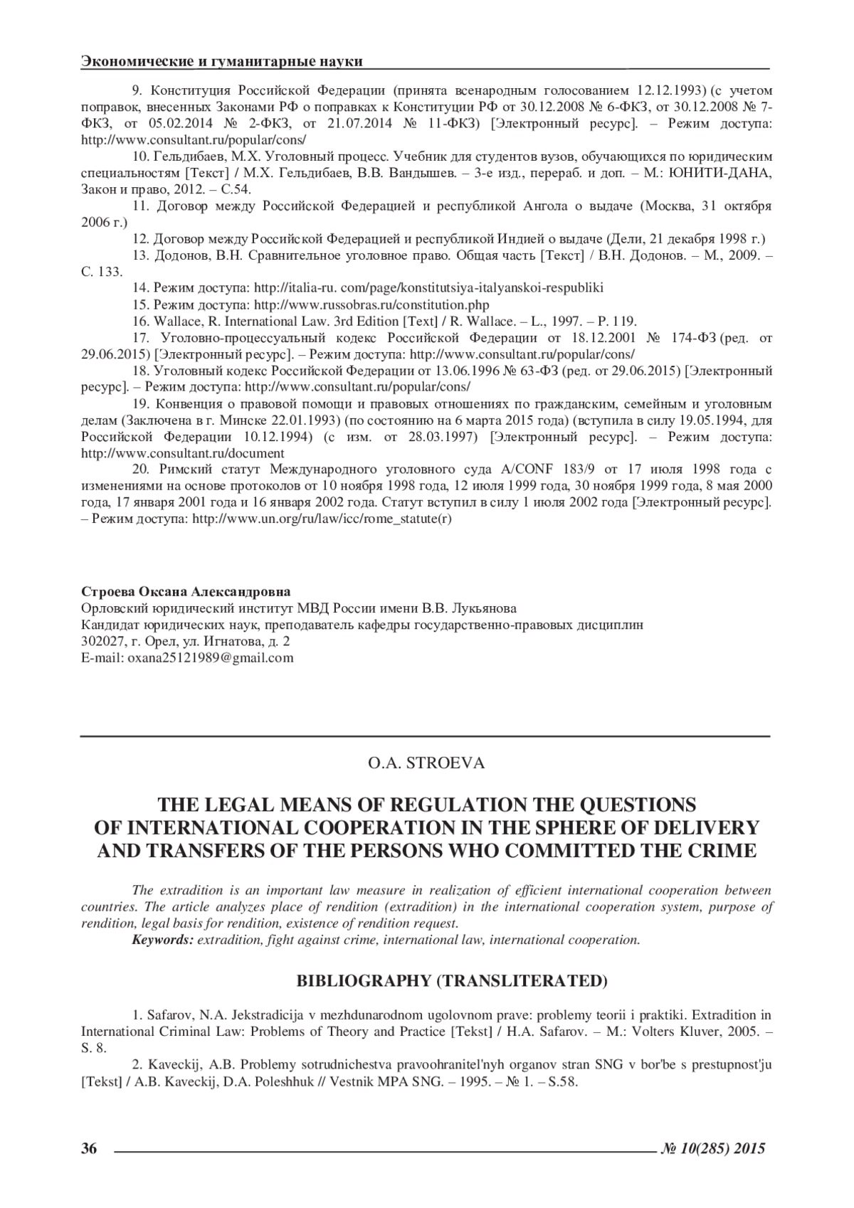 СТРОЕВА О. А. ПРАВОВЫЕ СРЕДСТВА РЕГУЛИРОВАНИЯ ВОПРОСОВ МЕЖДУНАРОДНОГО СОТРУДНИЧЕСТВА В СФЕРЕ ВЫДАЧИ И ПЕРЕДАЧИ ЛИЦ, СОВЕРШИВШИХ ПРЕСТУПЛЕНИЕ // ЭКОНОМИЧЕСКИЕ И ГУМАНИТАРНЫЕ НАУКИ. 2015. № 10 (285)