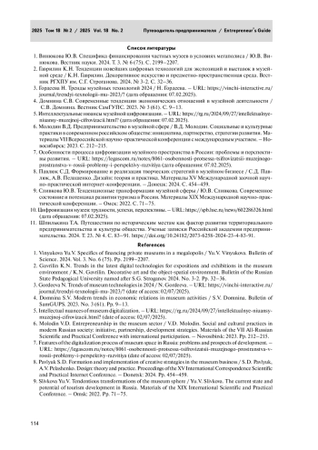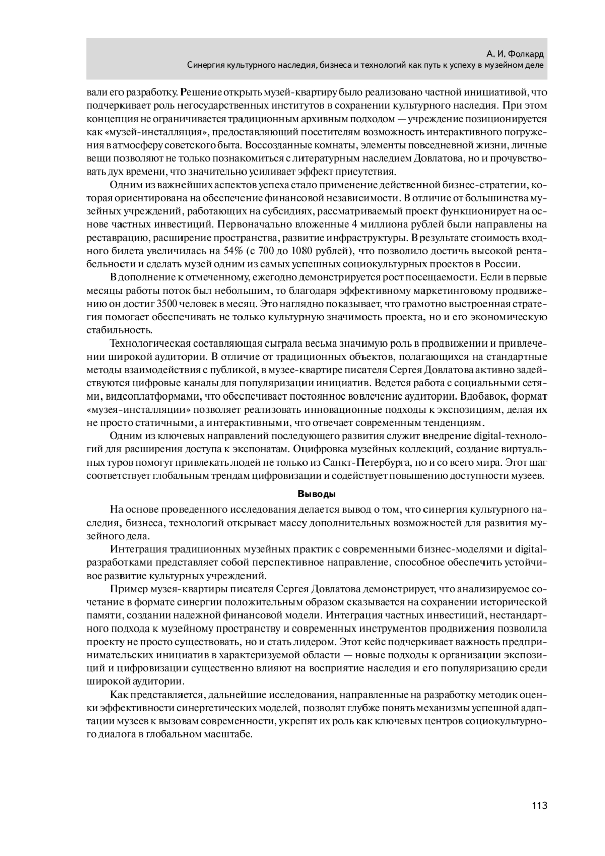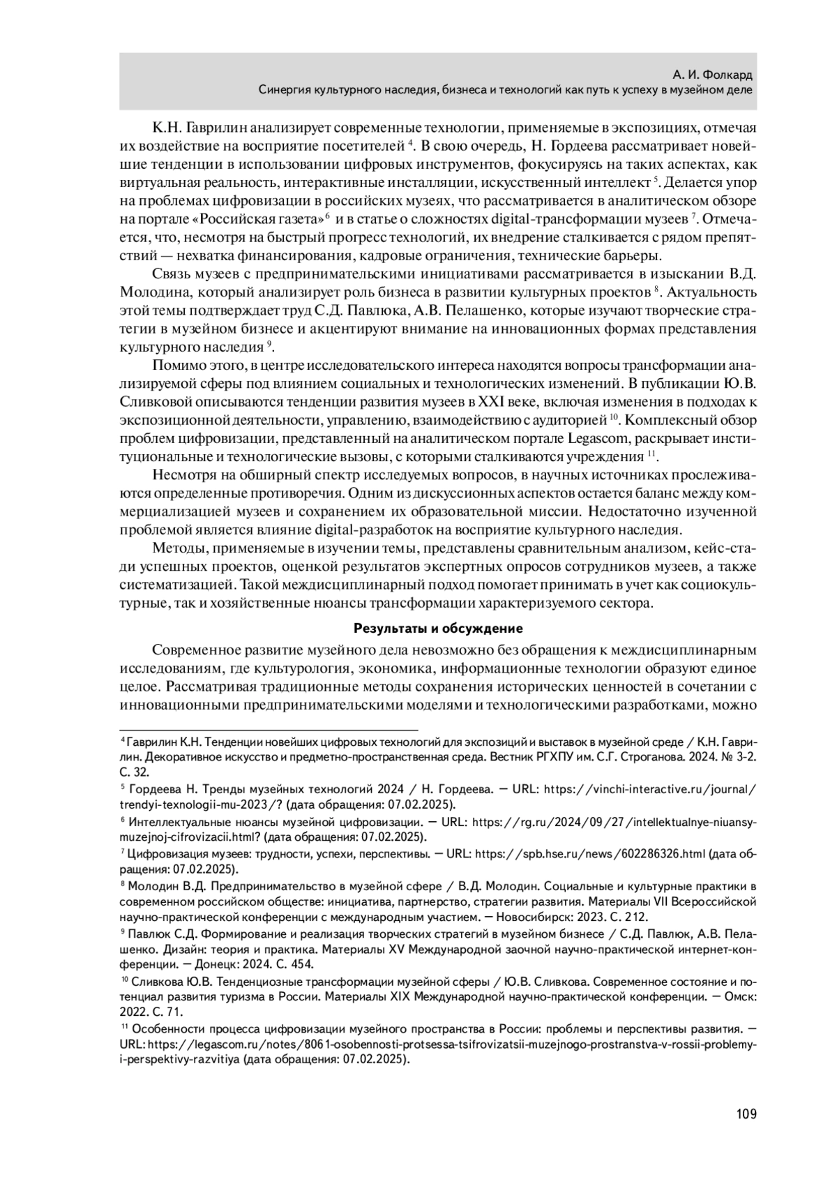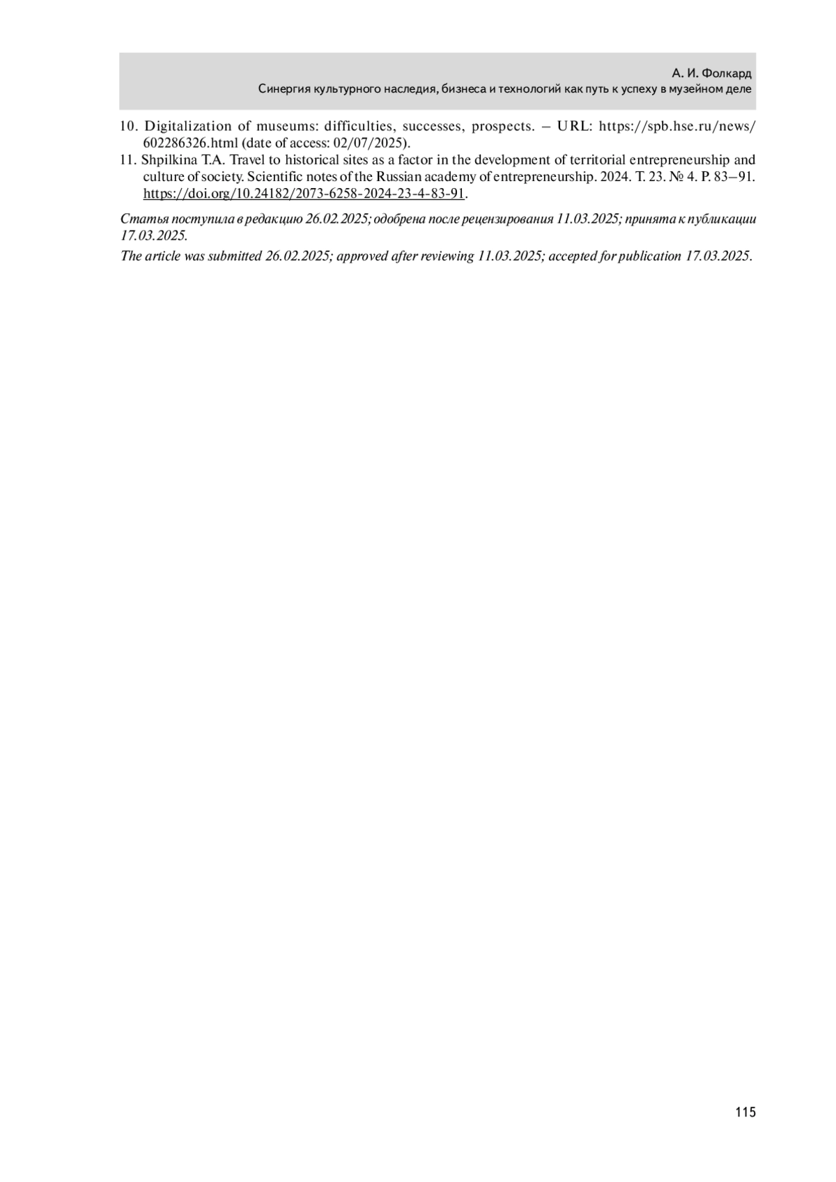 ФОЛКАРД А. И. СИНЕРГИЯ КУЛЬТУРНОГО НАСЛЕДИЯ, БИЗНЕСА И ТЕХНОЛОГИЙ КАК ПУТЬ К УСПЕХУ В МУЗЕЙНОМ ДЕЛЕ // РОССИЙСКАЯ АКАДЕМИЯ ПРЕДПРИНИМАТЕЛЬСТВА. 2025. Т. 18, № 2