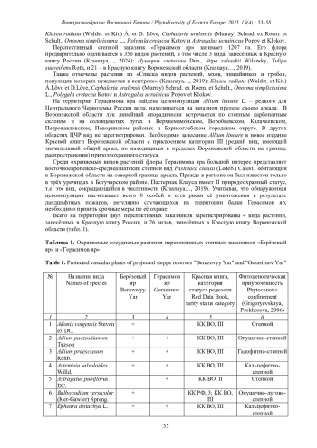 8. [Shcherbakov et al.] Щербаков А.В., Григорьевская А.Я., Владимиров Д.Р., Субботин А.С., Мирошникова А.А., Якименко О.В., Фатин С.Н. 2021. Охраняемые сосудистые растения Воронежской области: Монография. Воронеж. 445 с. EDN: KAOOYP