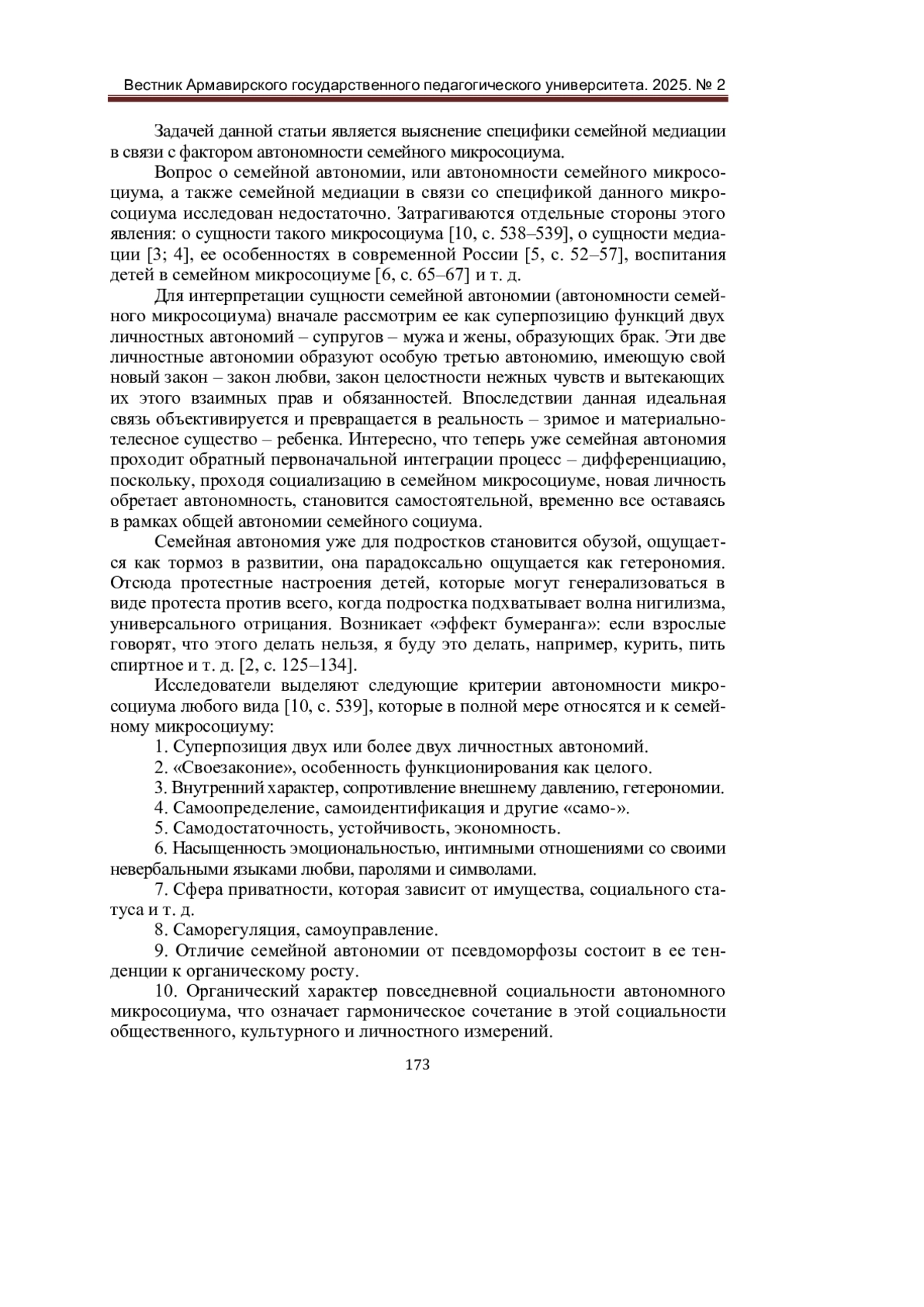 1. Акопова, Л. И. Автономия супругов по отношению к семейной системе как зона риска / Л. И. Акопова. - Текст: непосредственный // Северо-Кавказский психологический вестник. - 2012. - Том 10. - № 1. - С. 32-34. EDN: RCQIGP