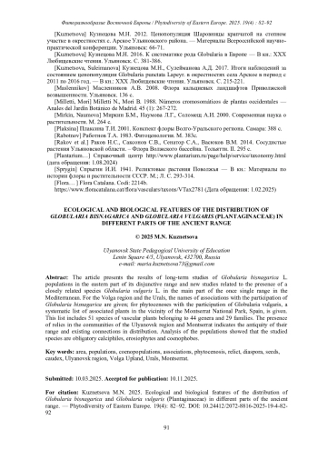 8. [Kuznetsova] Кузнецова М.Н. 2003. Биолого-ценотические особенности Globularia punctata Lapeyr. в центральной части Приволжской возвышенности: Автореф. дис…. канд. биол. наук. Тольятти, 18 с. EDN: NMNZQP